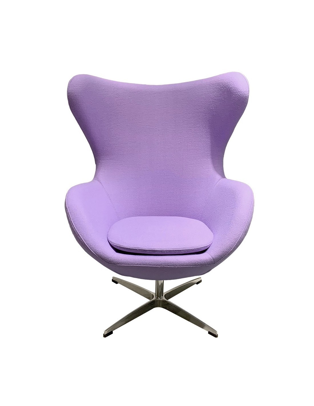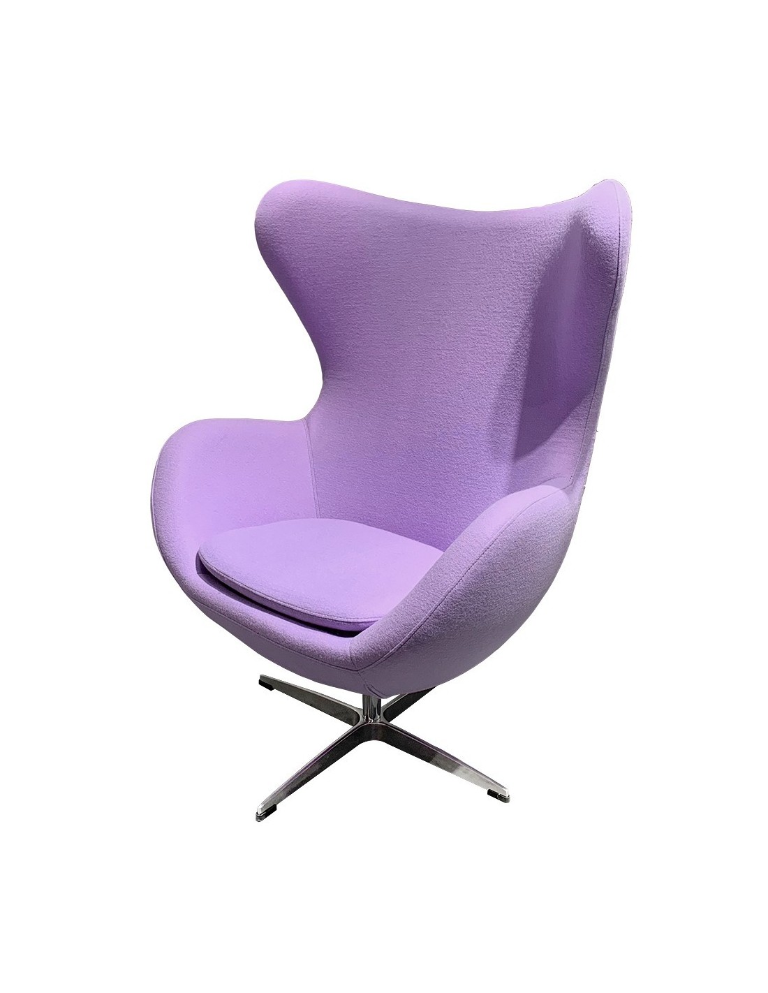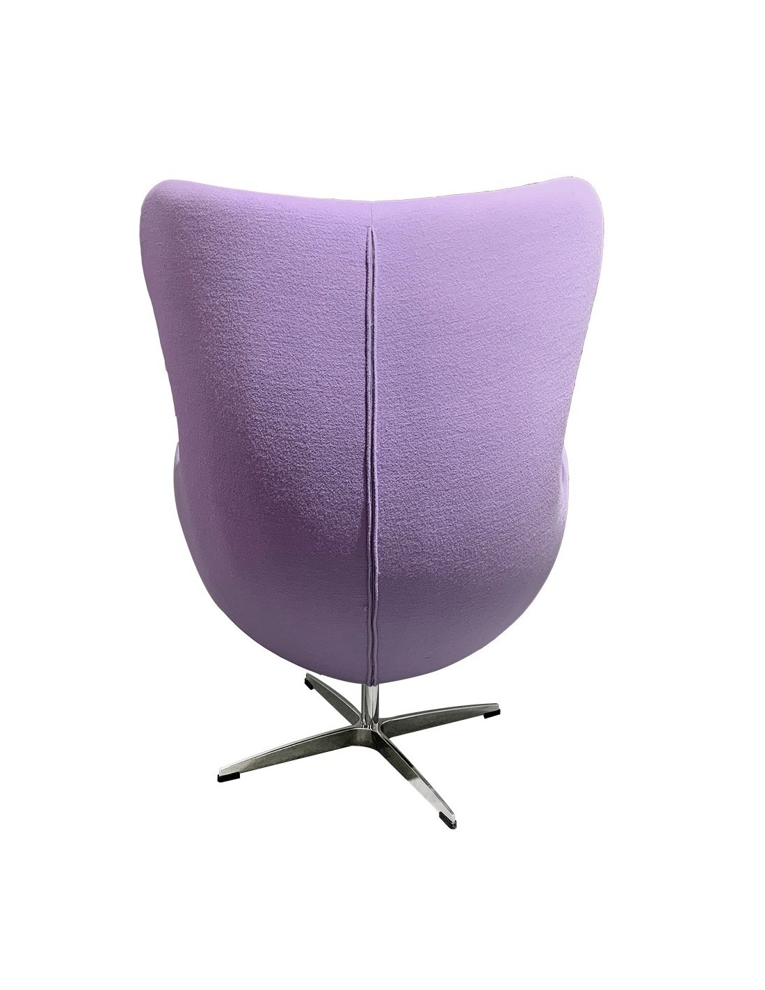 Sillón de diseño, giratorio, base y columna cromada, tapizado en tejido cachemira lila. Otros colores disponibles.