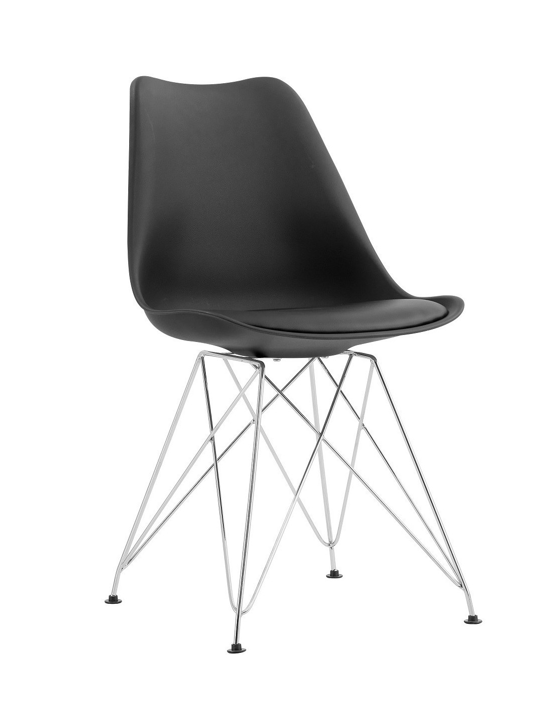 Silla de diseño, cromada, carcasa con cojín de asiento en similpiel negra. Otros colores disponibles.