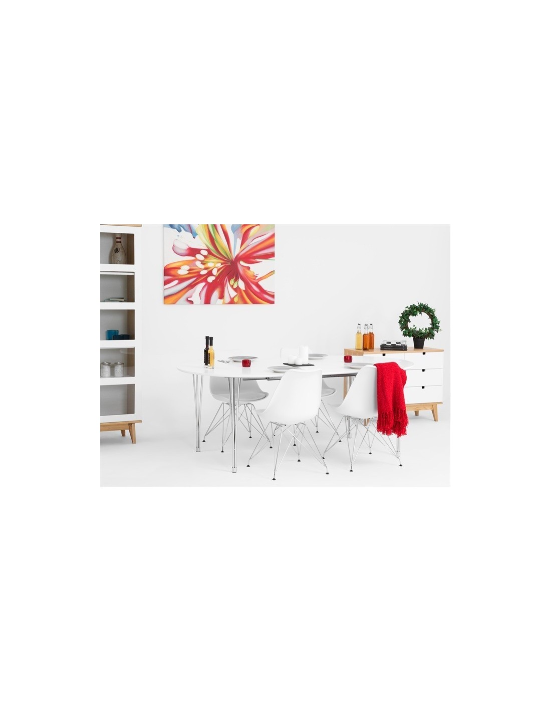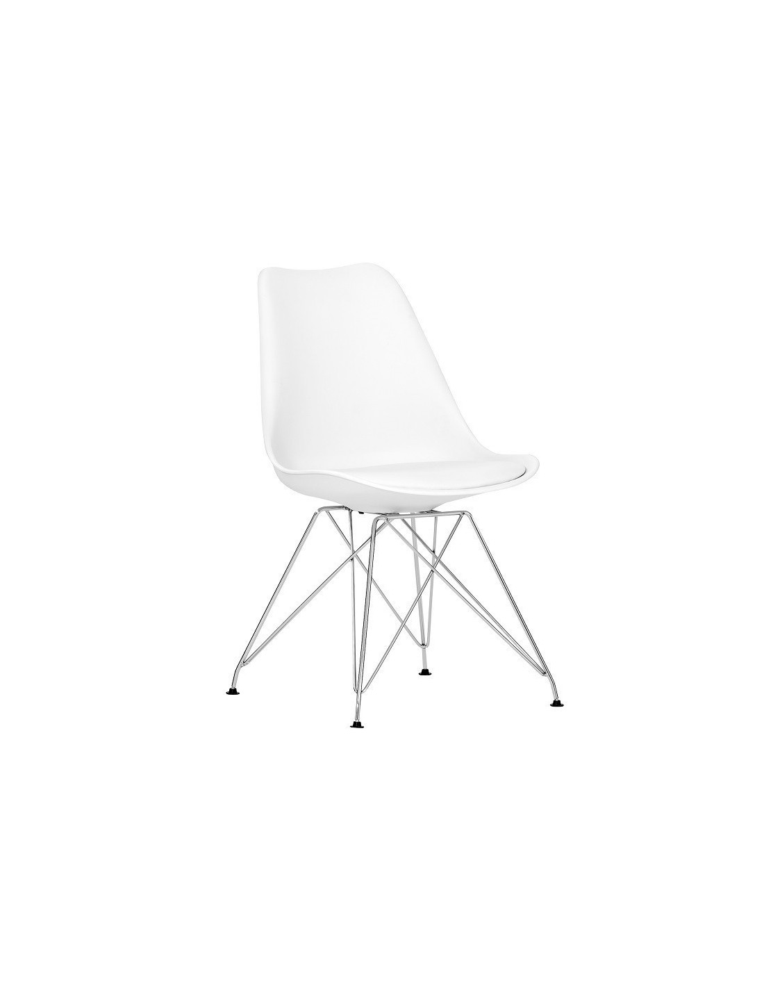 Silla de diseño, cromada, carcasa y cojín de asiento en similpiel blanca. Otros colores disponibles.