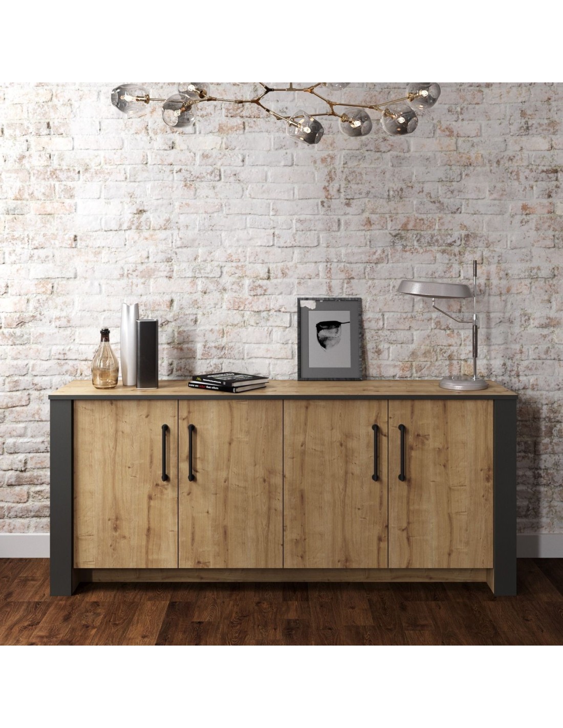 Mesa de diseño, armazón metálico con acabado negro, tapa de madera bilaminada