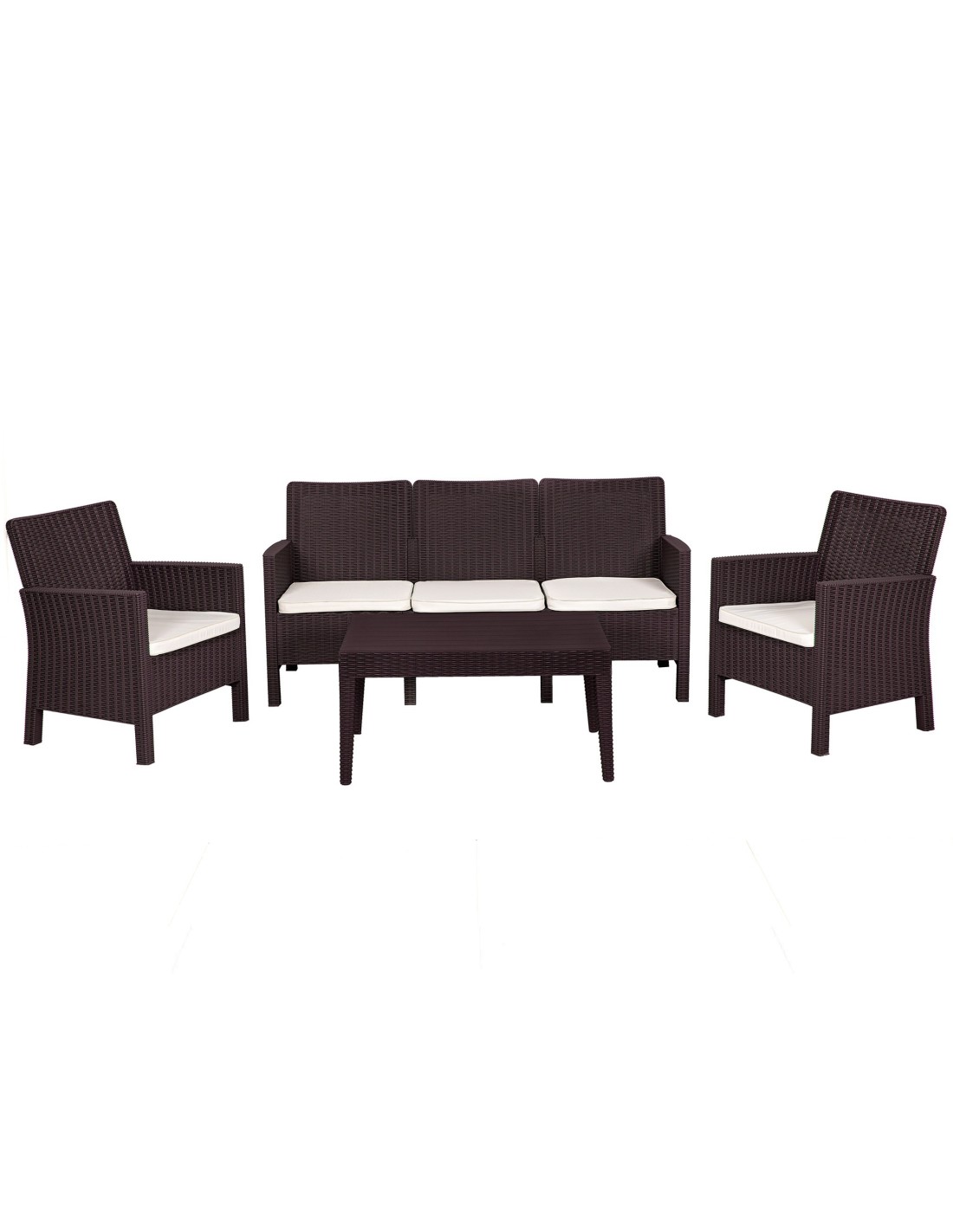 Set compuesto de: 2 unidades de Sillón, 1 unidad de Sofá de 3 plazas y una unidad de mesa baja, 100 % polipropileno color chocolate. Cojines incluidos. Uso exterior e interior