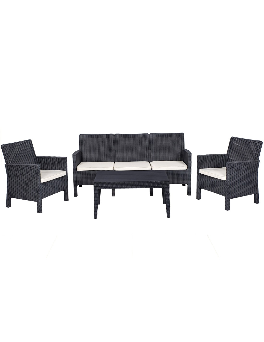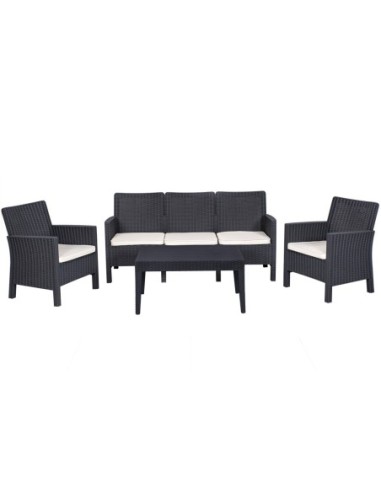 Set ADRIÁTICO, 2 Sillones + Sofá 3 plazas + mesa, polipropileno antracita, cojines incluidos