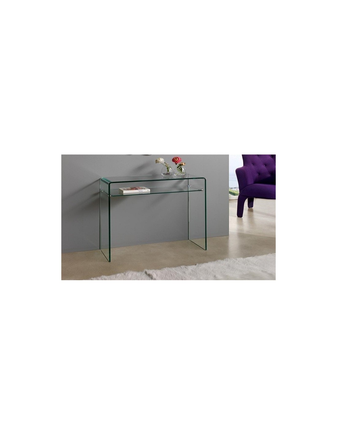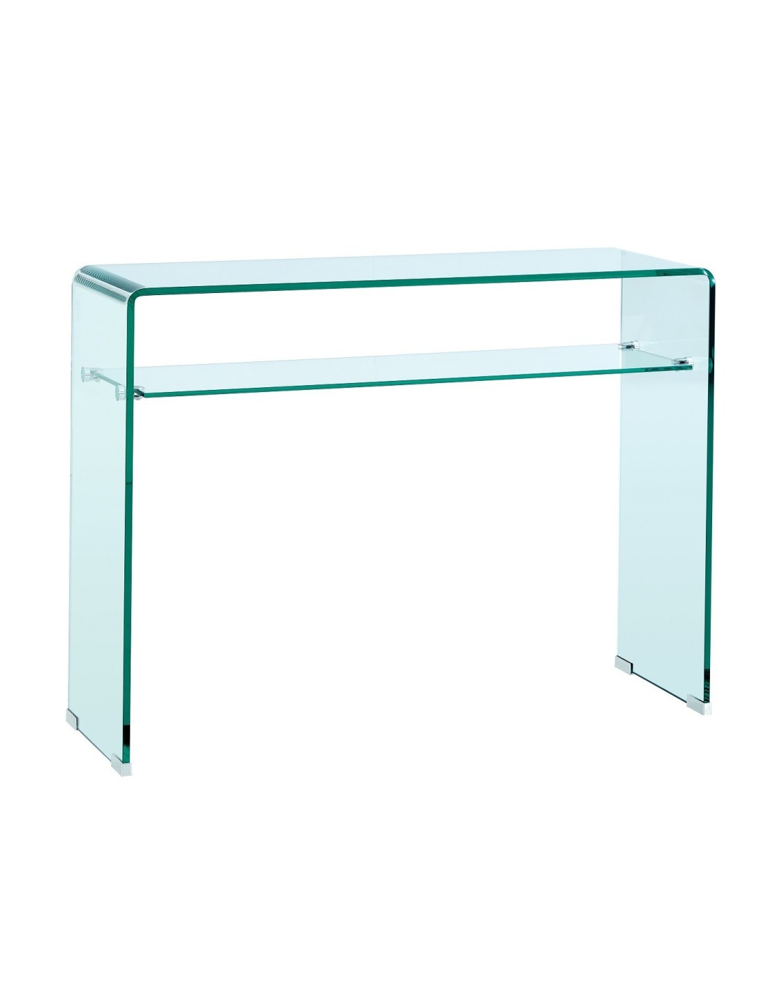 Consola de diseño fabricada íntegramente de cristal curvado con acabado transparente, estante inferior. Dispone de mesa baja rectangular a juego. Otras medidas disponibles