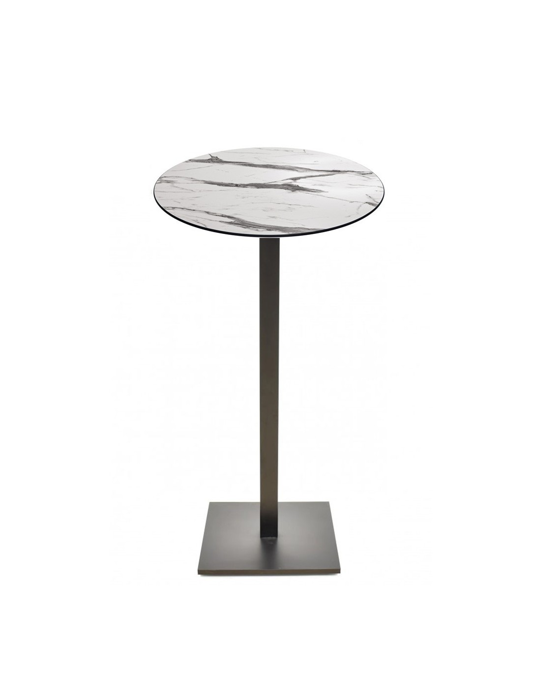 Mesa alta de diseño, multiusos, base de hierro y composite con acabado color negro/blanco, tapa de 70 cms, a elegir. Uso interior y exterior.
