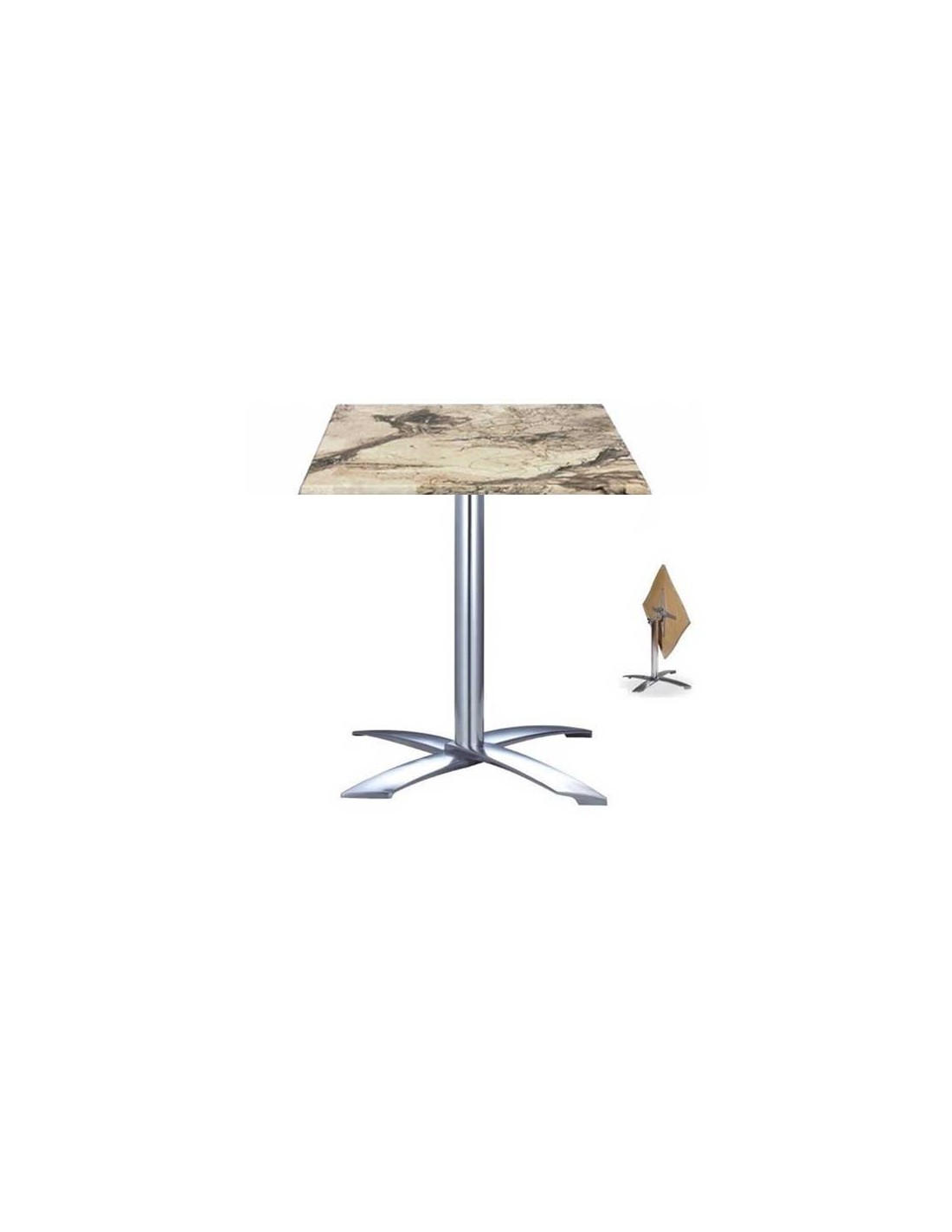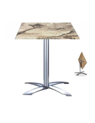 Mesa formada por base de aluminio, abatible, 4 brazos y tapa de 60x60 cms. Color a elegir. Uso en exteriores e interiores