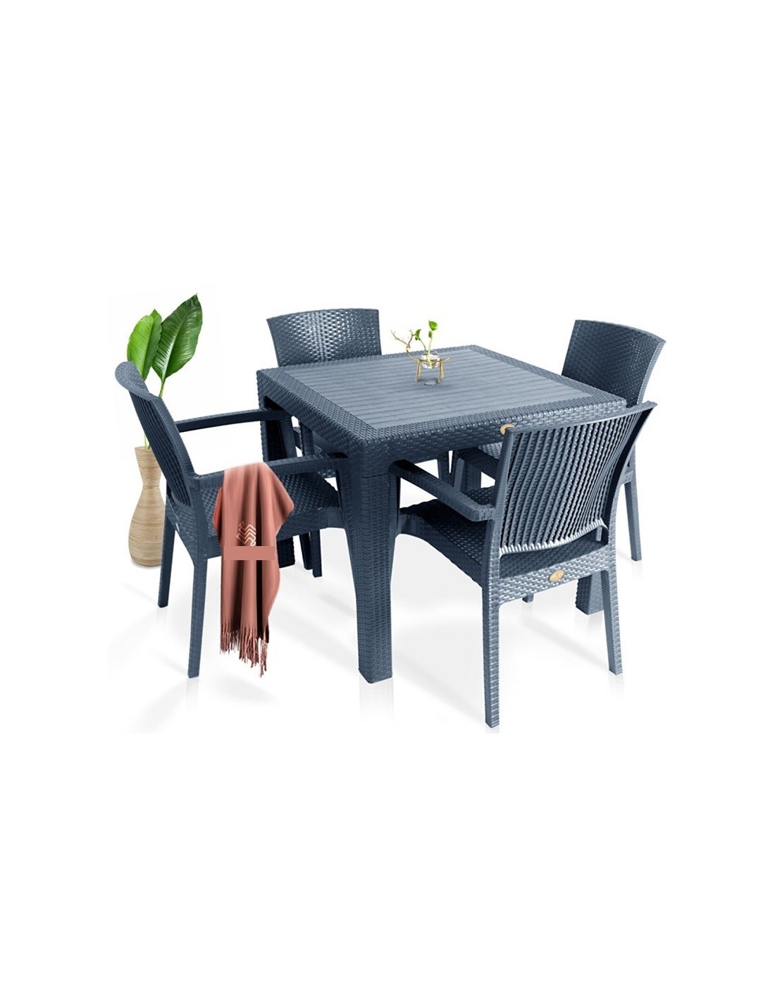 Mesa de diseño, imitación a rattán, polipropileno de color gris oscuro, 90 x 90 cms. Otros colores y medidas disponibles. Silla y sillón a juego