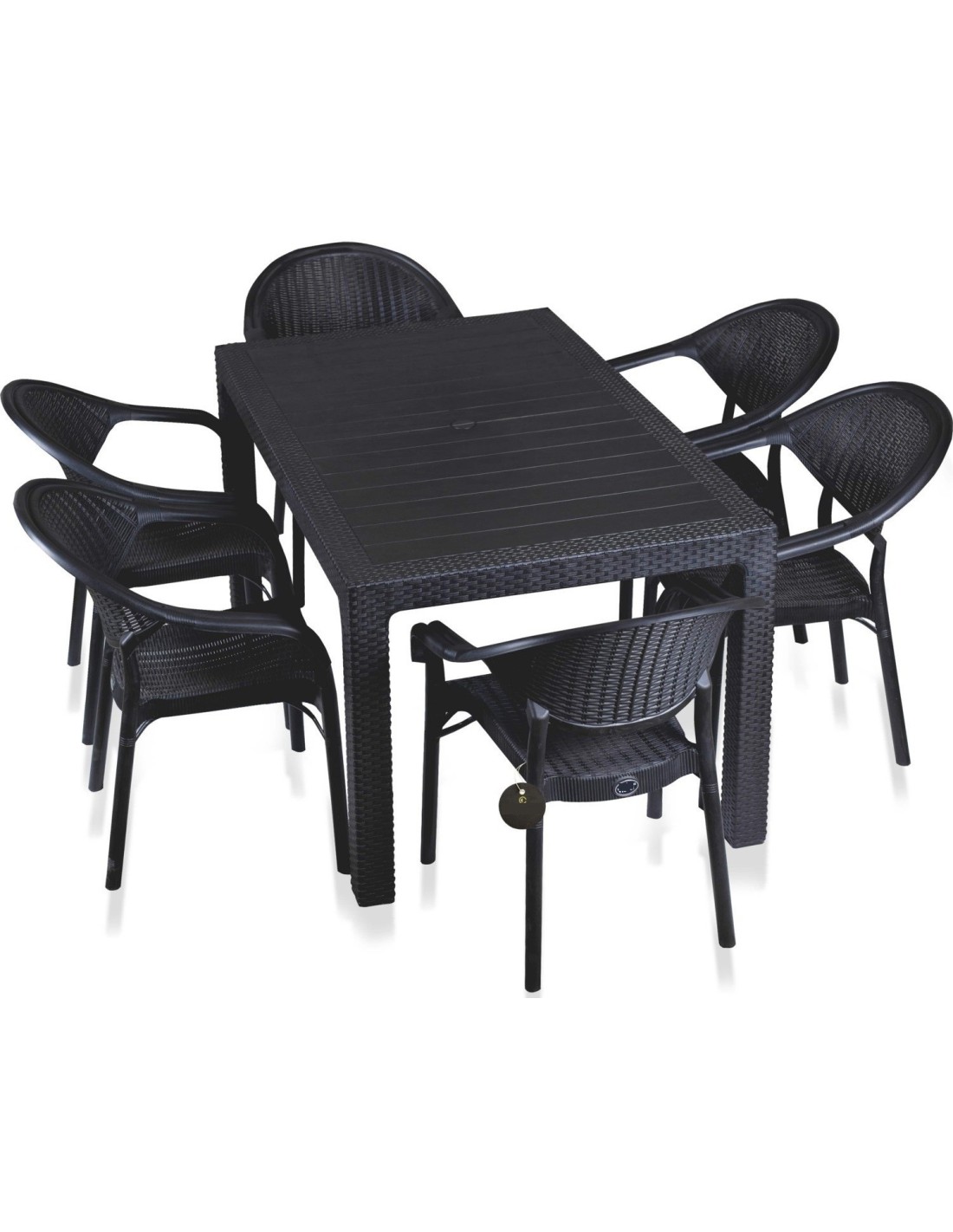 Mesa de diseño, imitación a rattán, polipropileno de color negro, 150 x 90 cms. Otros colores y medidas disponibles. Silla y sillón a juego