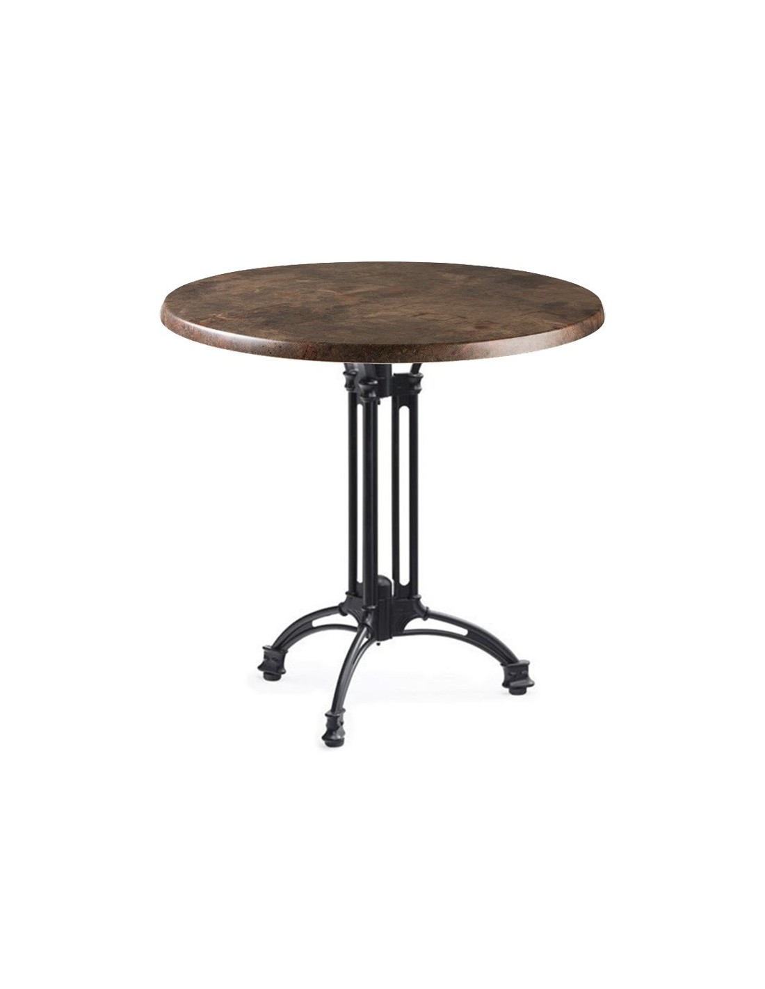 Mesa de fundición de aluminio de 3 puntas, revestida con pintura de resina negro mate y tapa de 70 cms de diámetro. Color a elegir. Uso interior y exterior.