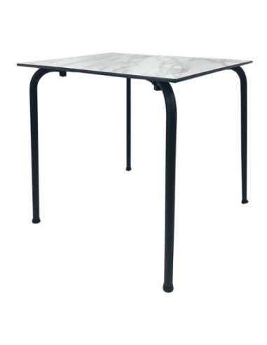 Mesa apilable, armazón de metal acabado epoxi color negro, tapa fenólica de 69 x 69 cms. Color mármol blanco. Uso en exteriores e interiores
