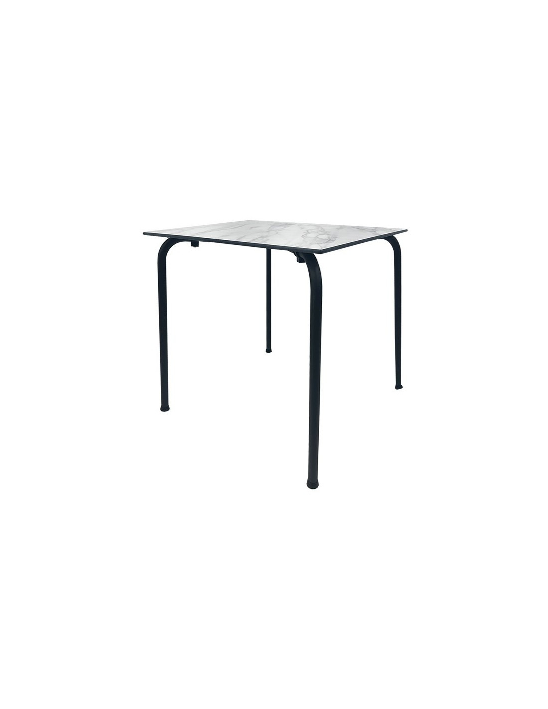 Mesa FERAY, apilable, epoxi color negro, tablero fenólico mármol blanco 69 x 69 cms.