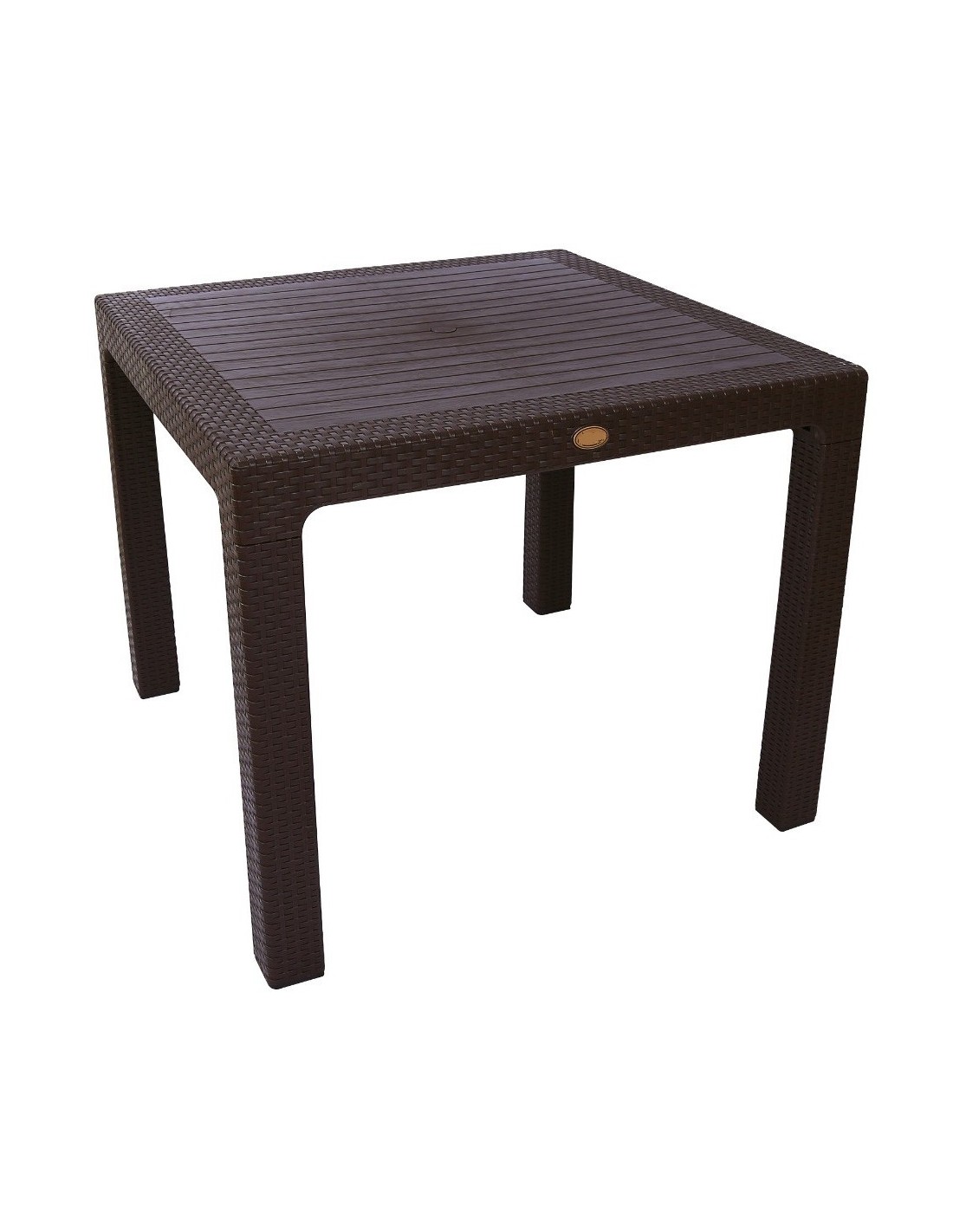 Mesa de diseño, imitación a rattán, polipropileno de color marrón chocolate, 90 x 90 cms. Otros colores y medidas disponibles. Silla y sillón a juego