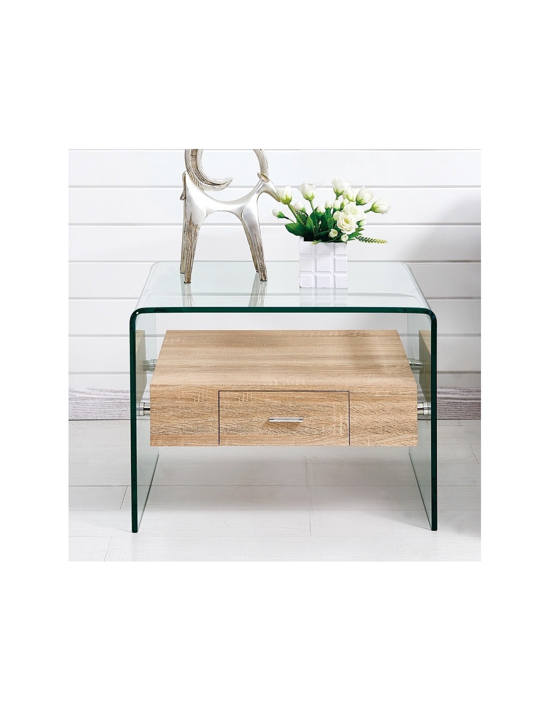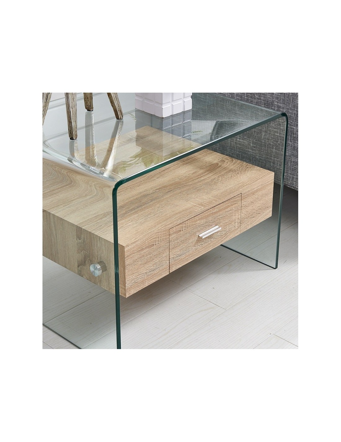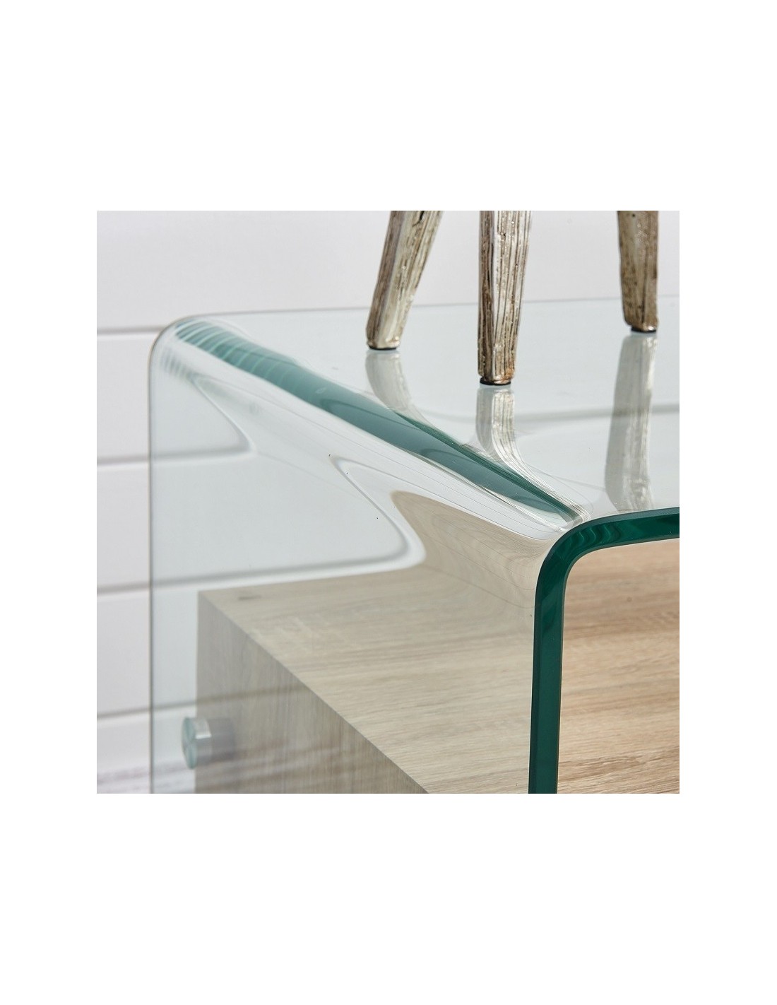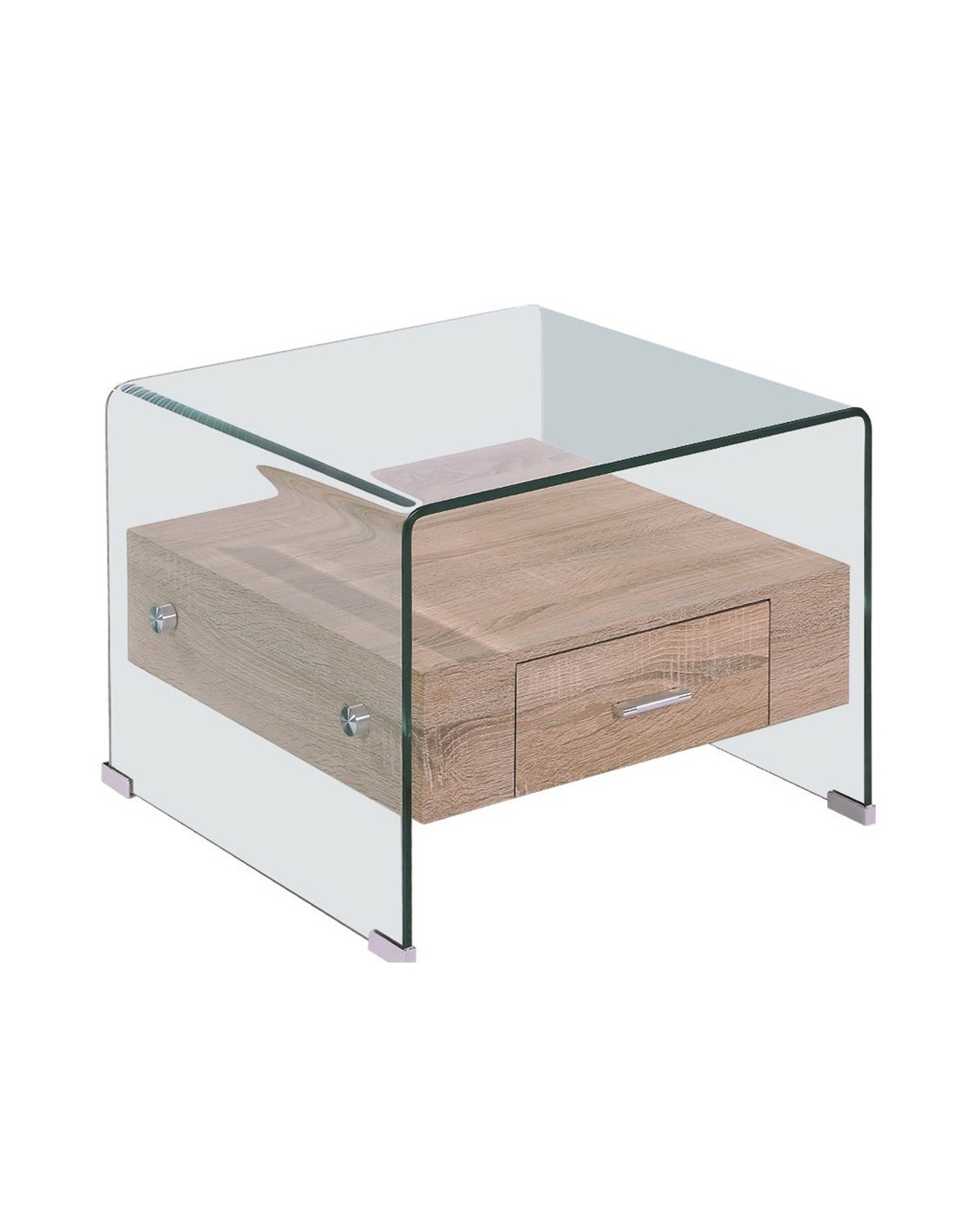 Mesa baja de diseño, estante con cajón de MDF, cristal curvado de 12 mm. de espesor