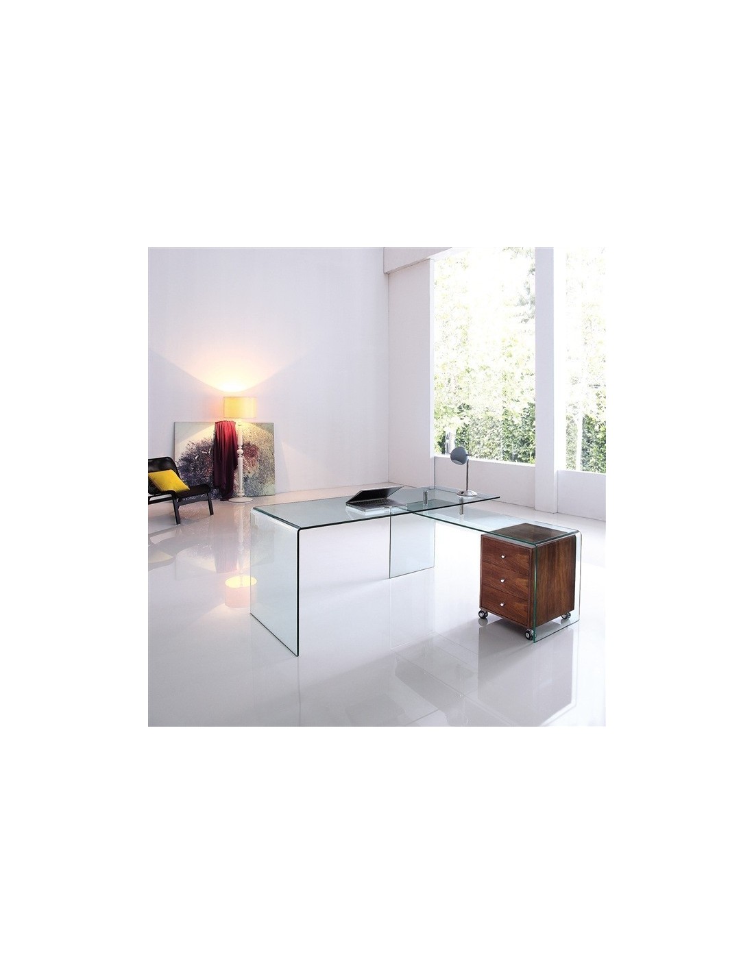 Conjunto de oficina compuesto de: Mesa de cristal curvado de 170 x 70 cms con altura de 73 cms más mesa ala auxiliar a derecha de 140 x 50 cms con altura de 60 cms, todo de 12 mm. de espesor con acabado transparente. Importante - Buc de cajones NO INCLUIDO.