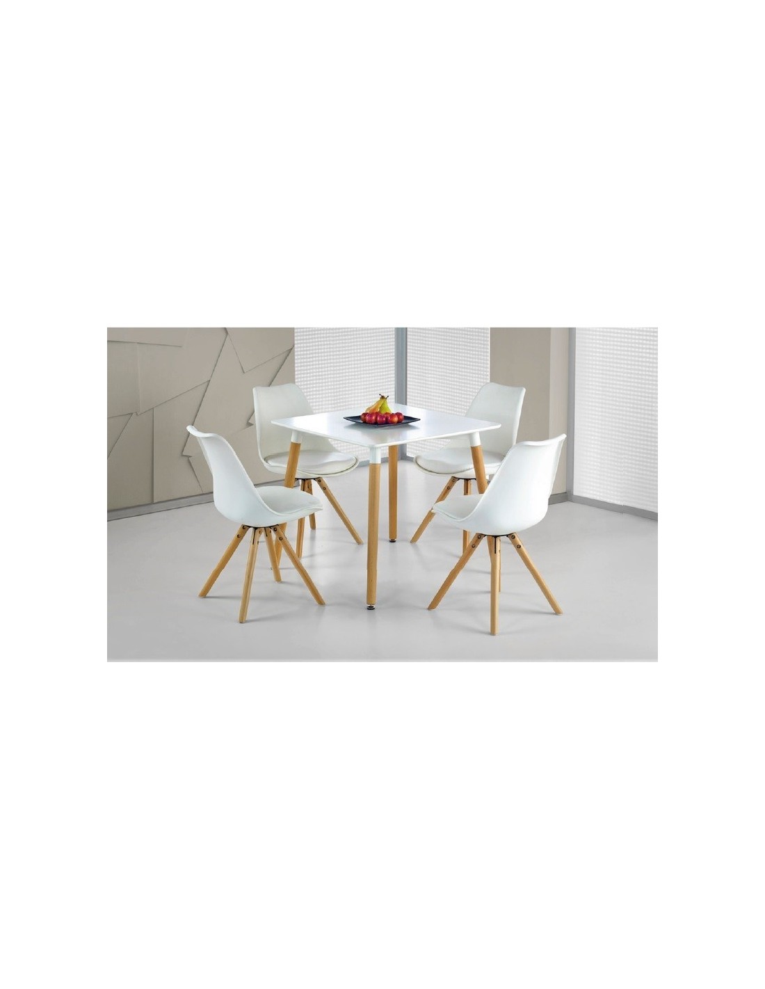 Mesa de diseño, patas de madera de haya maciza, tapa lacada en blanco. Otros colores disponibles. Sillas y sillones a juego