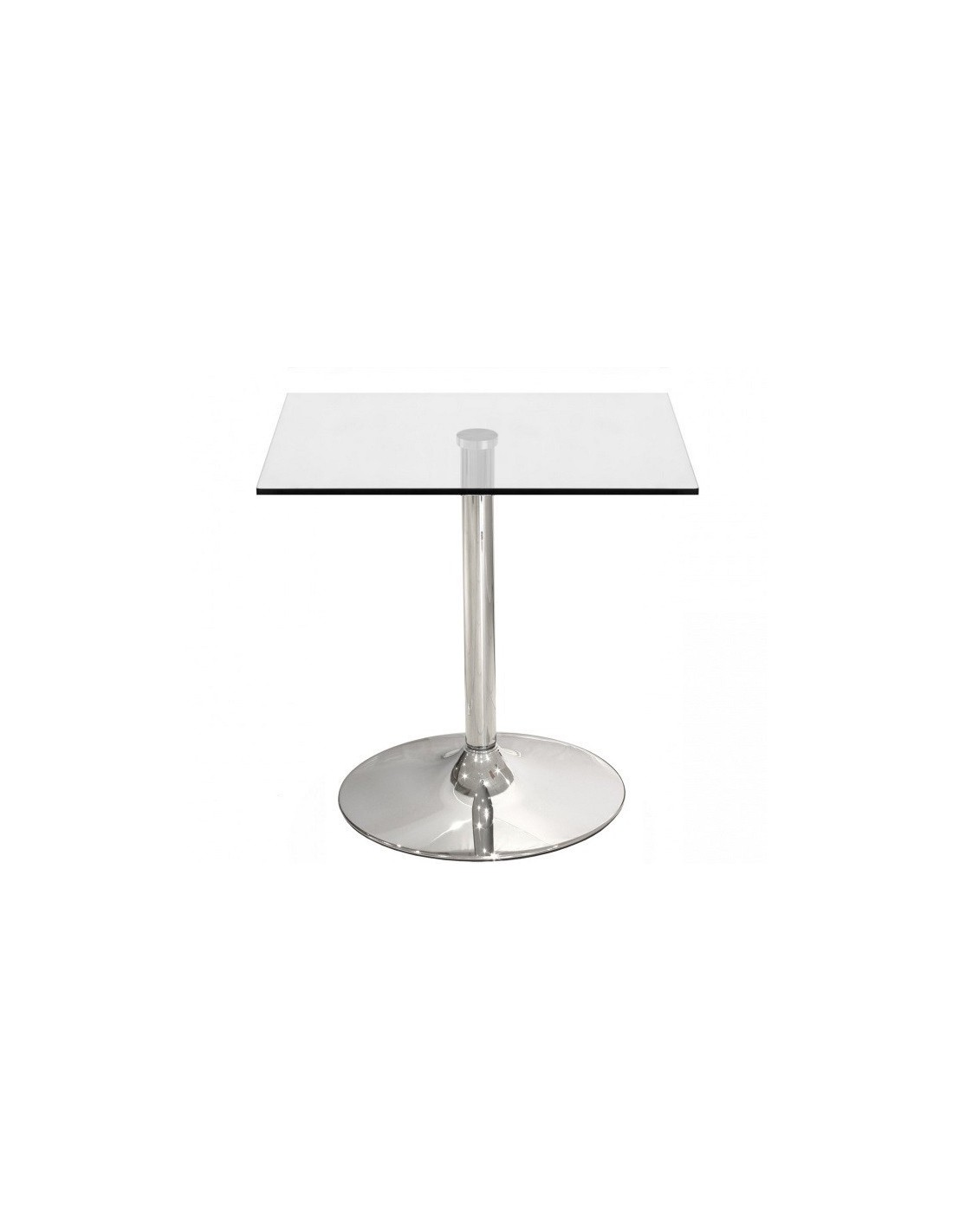 Mesa de diseño multiusos, cuadrada,  cromada,  cristal templado de 10 mm. de espesor. Altura 72 cms. Otras medidas y formatos disponibles. Uso en interiores