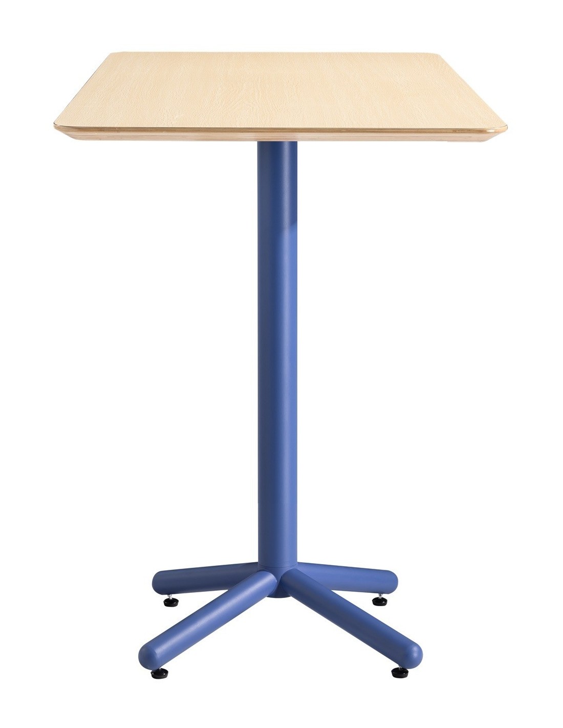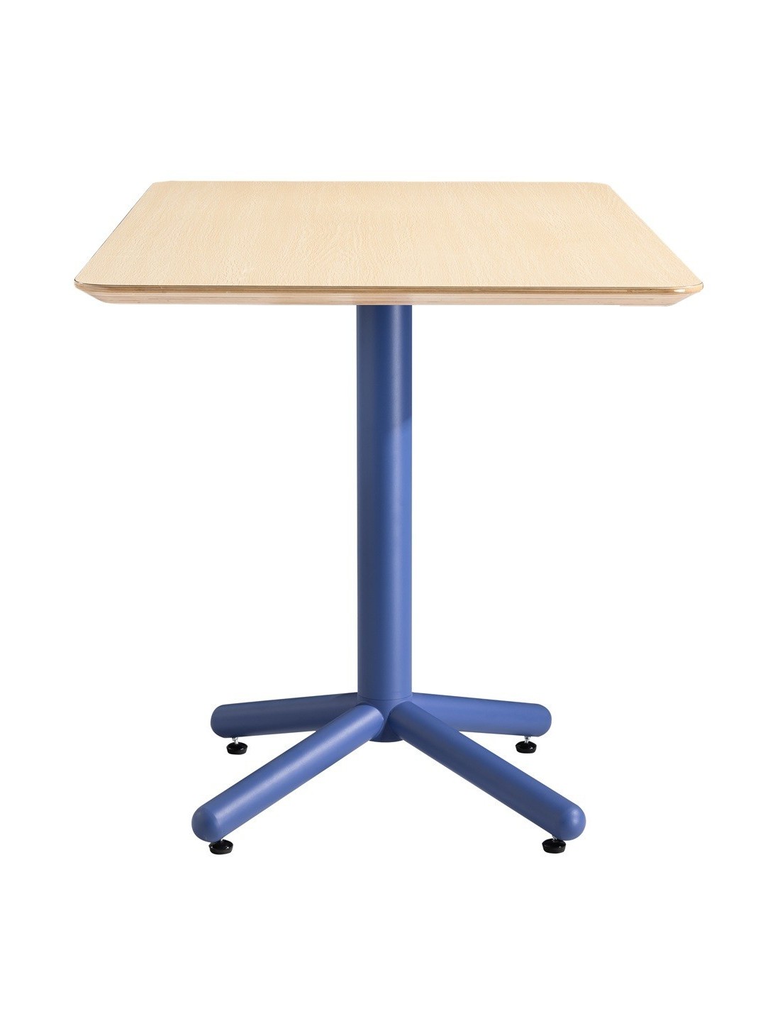 Mesa de diseño, multiusos, armazón central tubular con acabado azul, tapa cuadrada de contrachapado revestido con HPL con acabado  natural. Silla y mesas a juego.