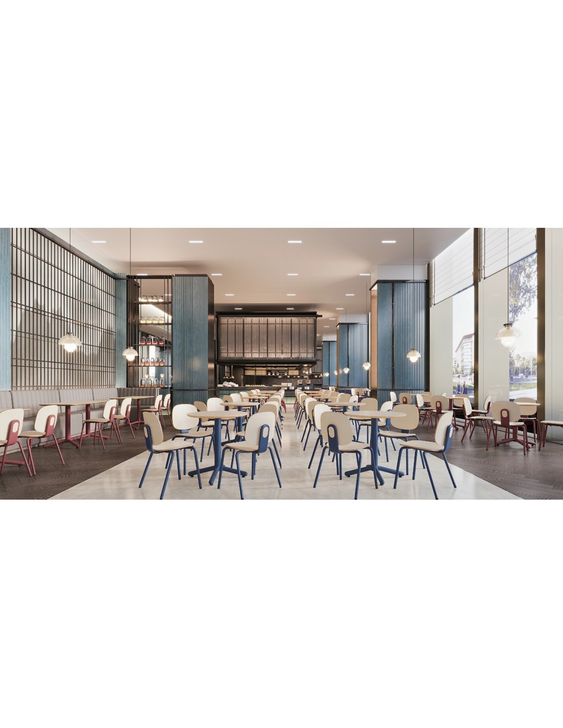Mesa alta de diseño, multiusos, armazón central tubular con acabado azul, tapa cuadrada de contrachapado revestido con HPL con acabado  natural. Taburete y mesas a juego.