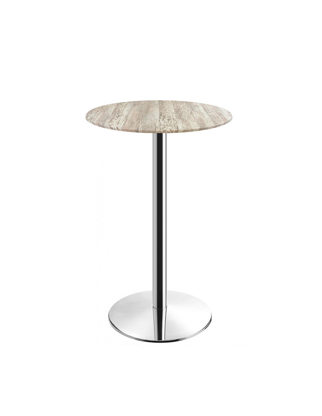 Mesa alta con pie central, acero inoxidable pulido - acabado brillo espejo -. Base circular de 45 cms y tapa de 60 cms de diámetro, a elegir. Uso en interiores.