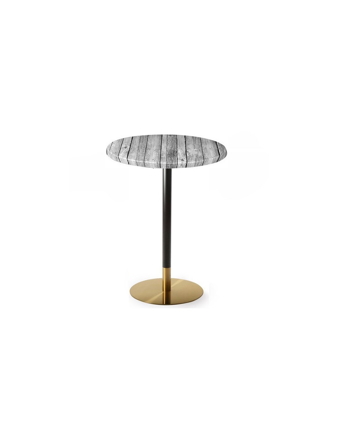 Mesa alta de diseño, multiusos, base de acero inoxidable acabado negro y dorado y tapa de 70 cms de diámetro a elegir.