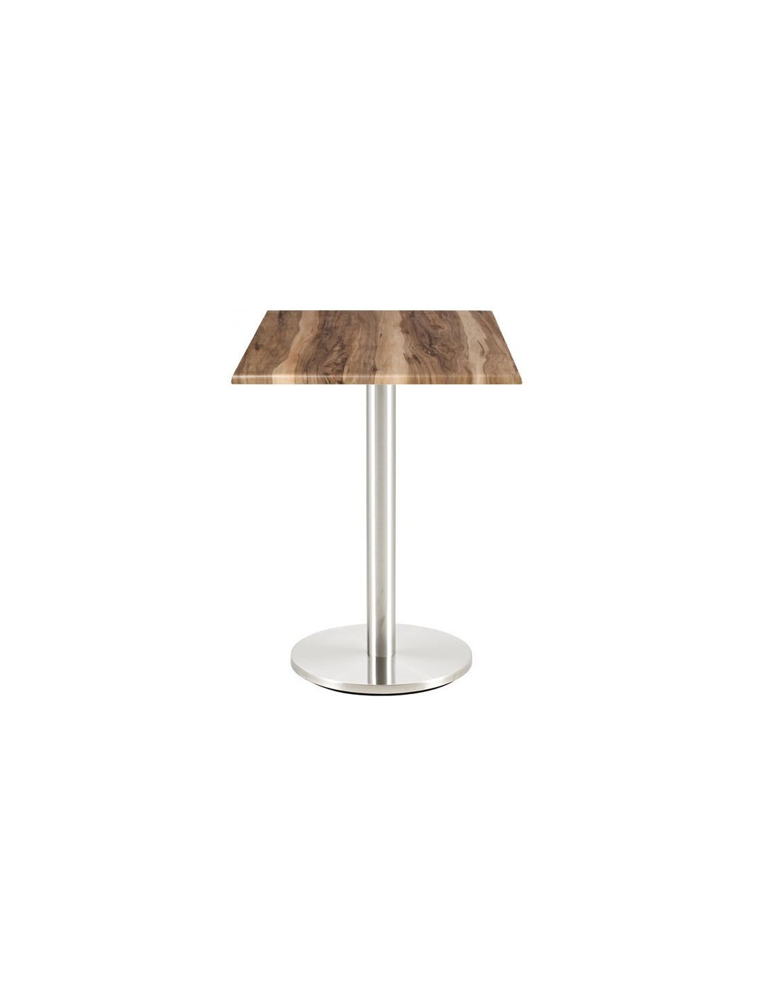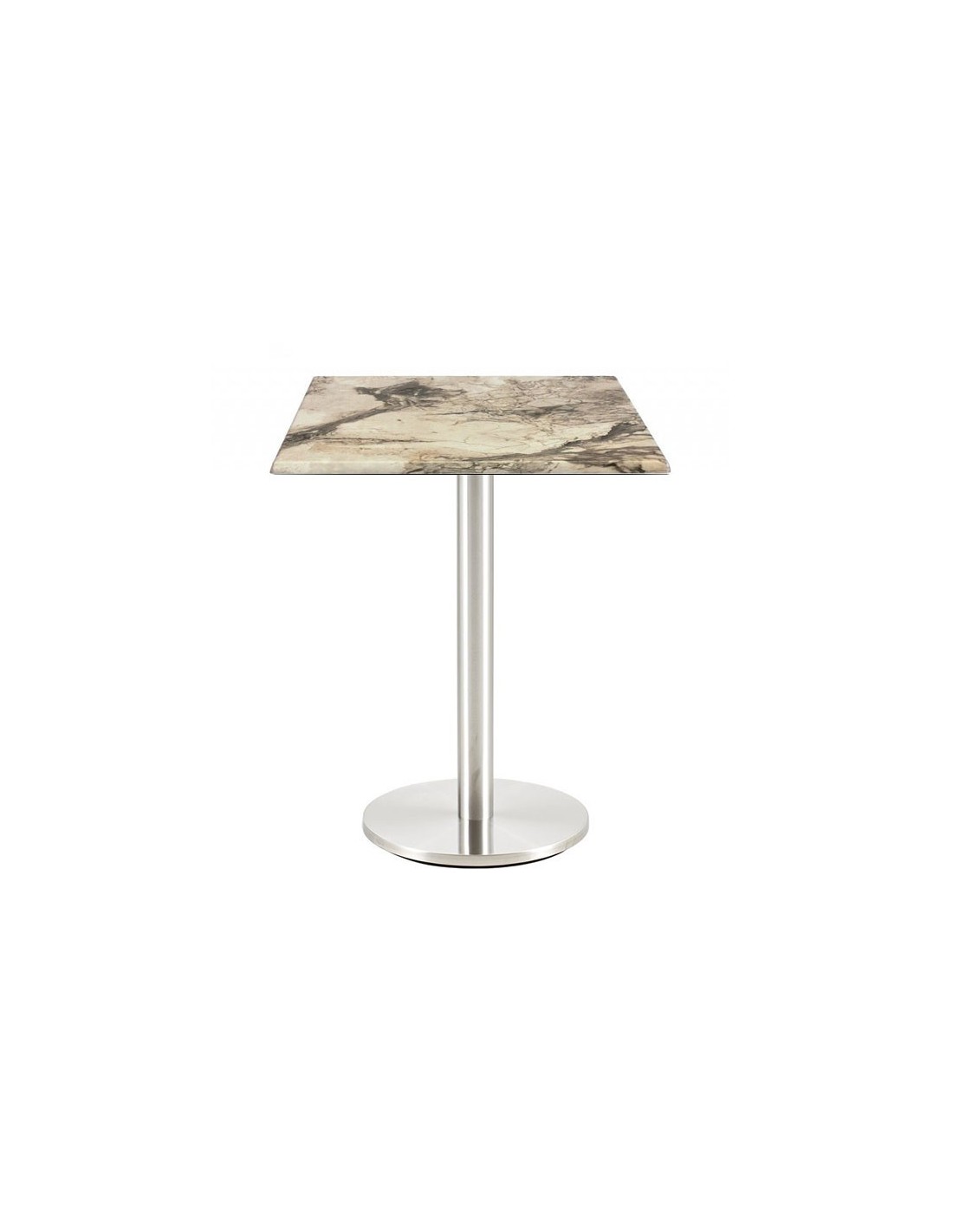 Mesa con pie central, acero inoxidable pulido - acabado satinado -. Base circular de 45 cms y tapa de 70 x 70 cms, a elegir. Uso en interiores.