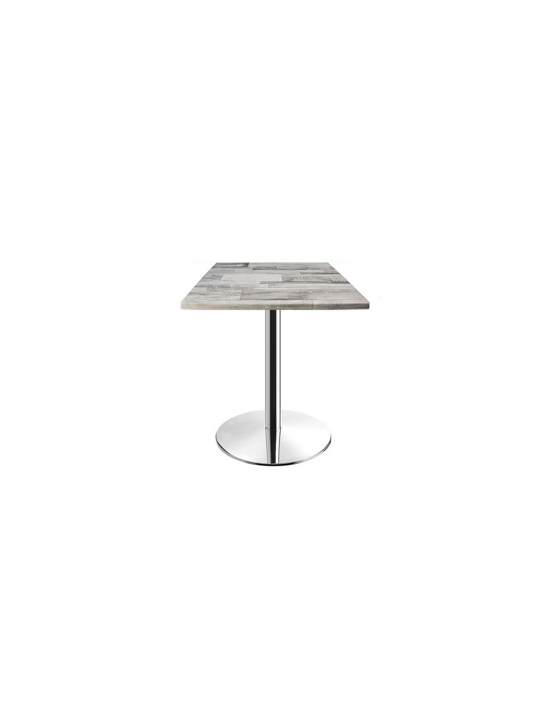 Mesa con pie central, acero inoxidable pulido - acabado brillo espejo -. Base circular de 45 cms y tapa de 60x60 cms, a elegir. Uso en interiores.