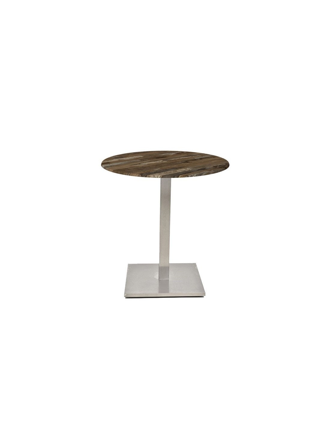 Mesa con pie central, acero inoxidable pulido - acabado satinado -. Base de 45 x 45 cms y tapa de 70 cm de diámetro, a elegir. Uso en interiores.