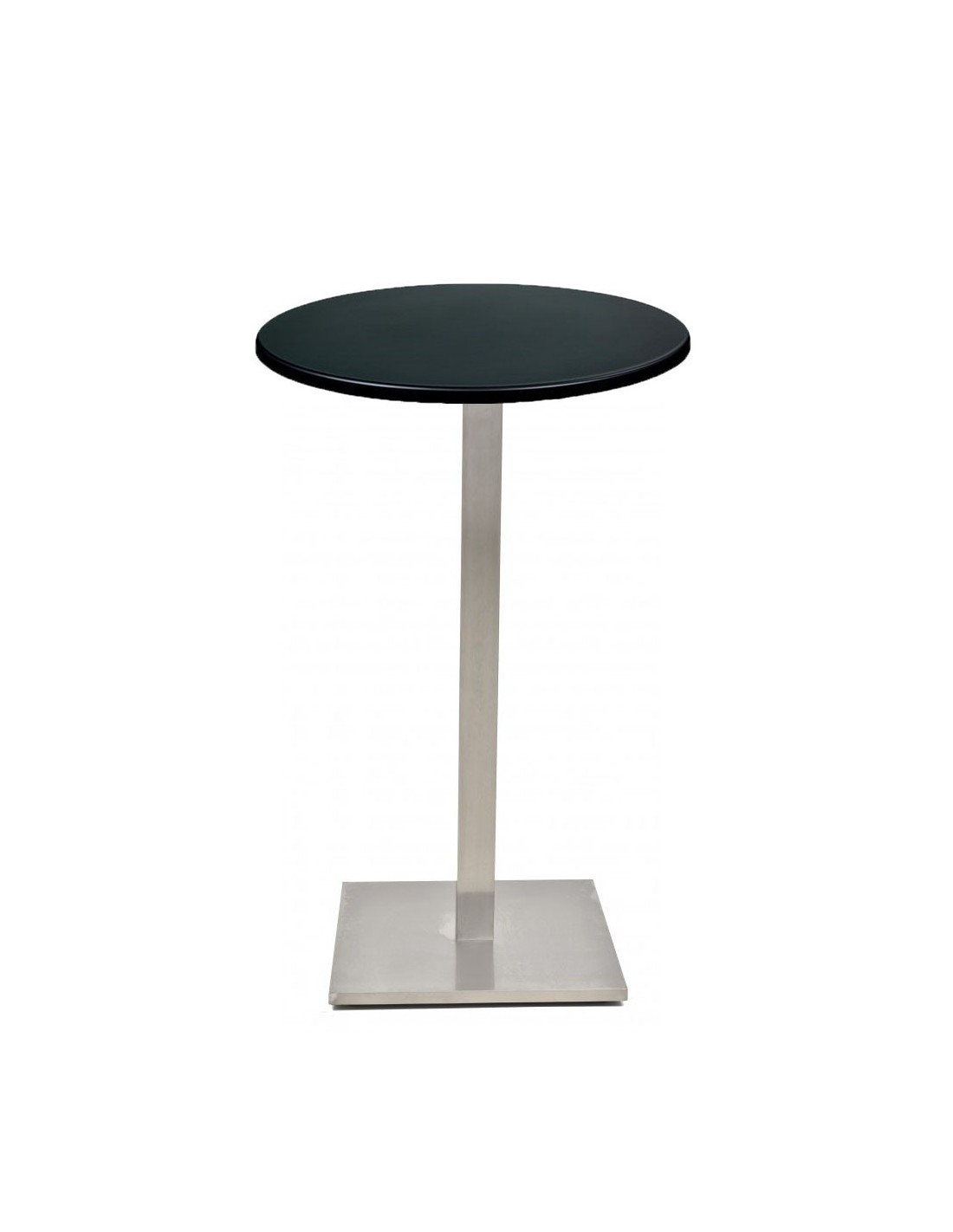 Mesa alta con pie central, acero inoxidable pulido - acabado satinado -. Base de 45 x 45 cms y tapa de 70 cm de diámetro, a elegir. Uso en interiores.