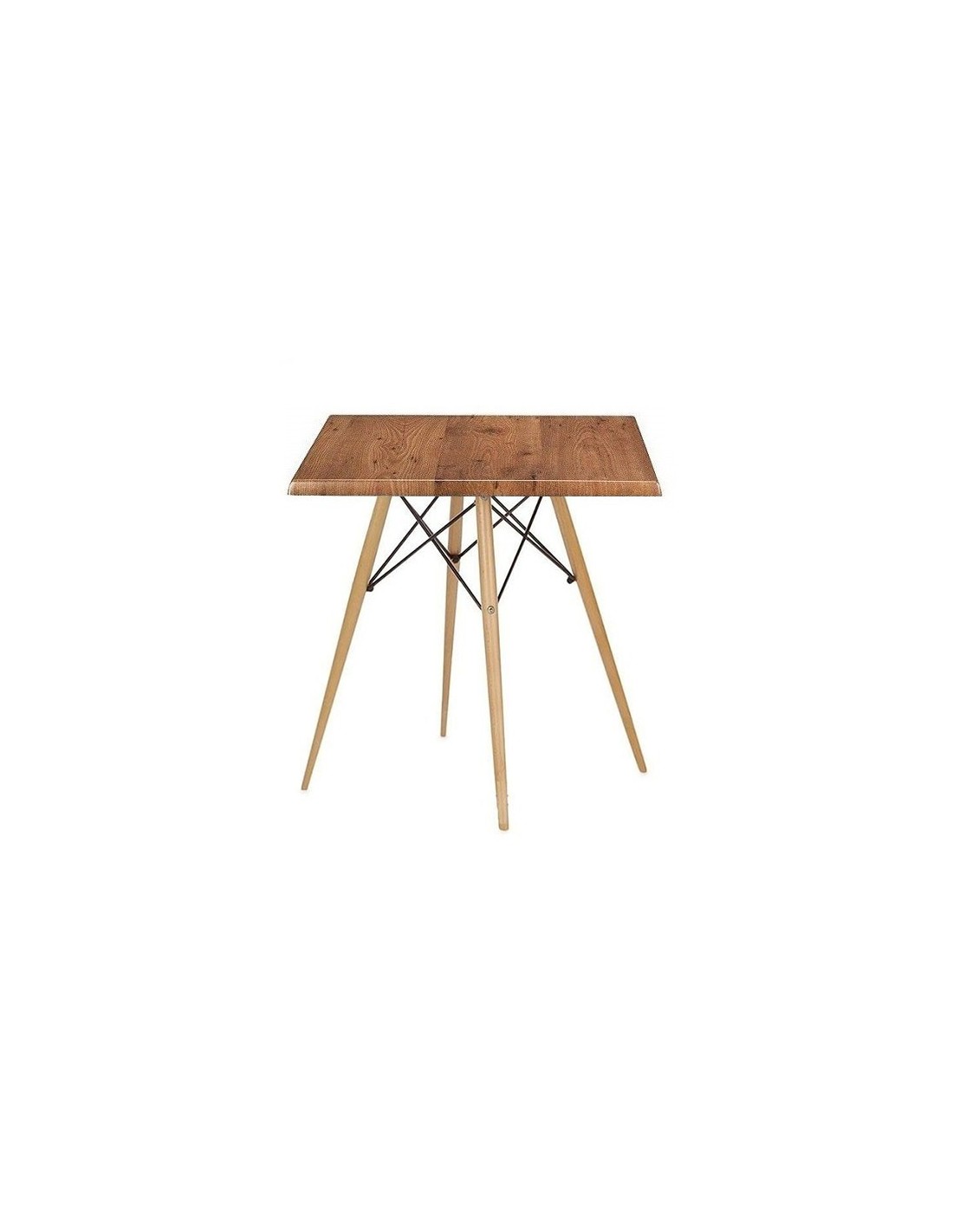 Mesa de diseño, base de madera de haya con varillas metálicas de unión, tapa de 60 x 60 cms, color a elegir. Sillas y sillones a juego.