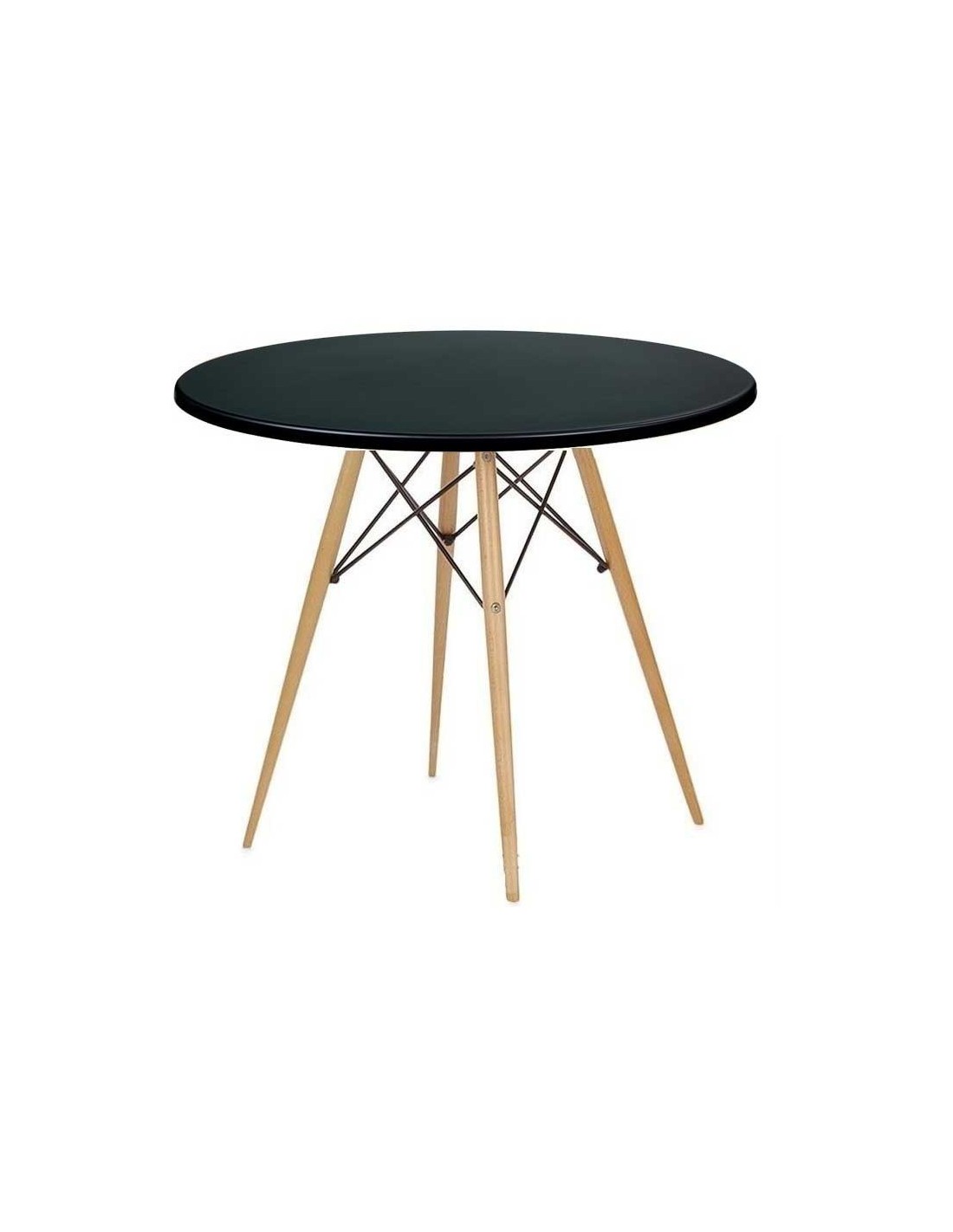 Mesa de diseño, base de madera de haya con varillas metálicas de unión, tapa de 80 cms de diámetro, color a elegir. Sillas y sillones a juego.