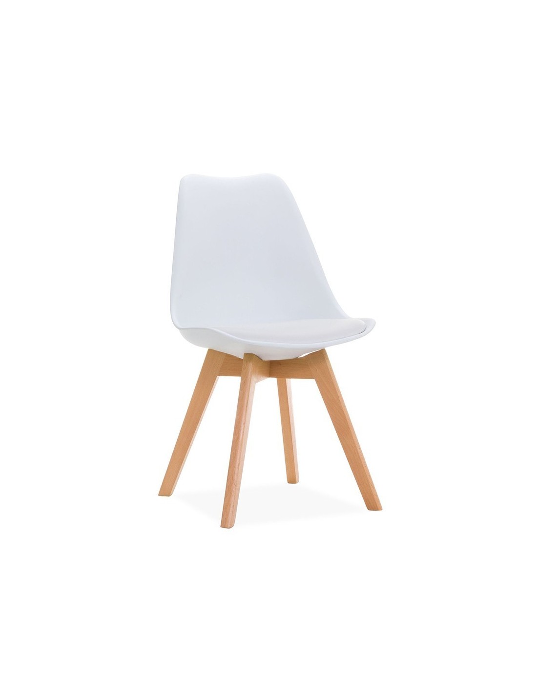 Silla de diseño, madera de haya, carcasa de polipropileno blanco, cojín de asiento en similpiel blanco. Otros colores disponibles.