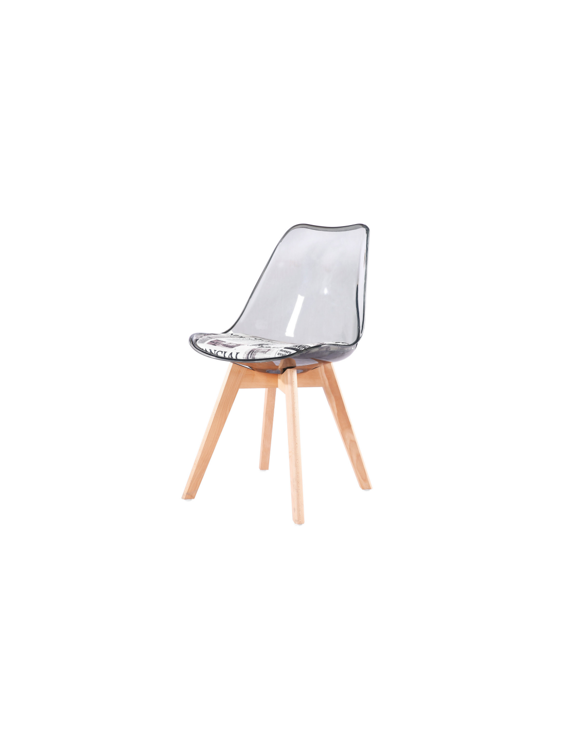 Silla de diseño, madera de haya, carcasa de PET con acabado transparente, cojín de asiento en tejido estampado moderno. Ver detalle del estampado en imágenes auxiliares