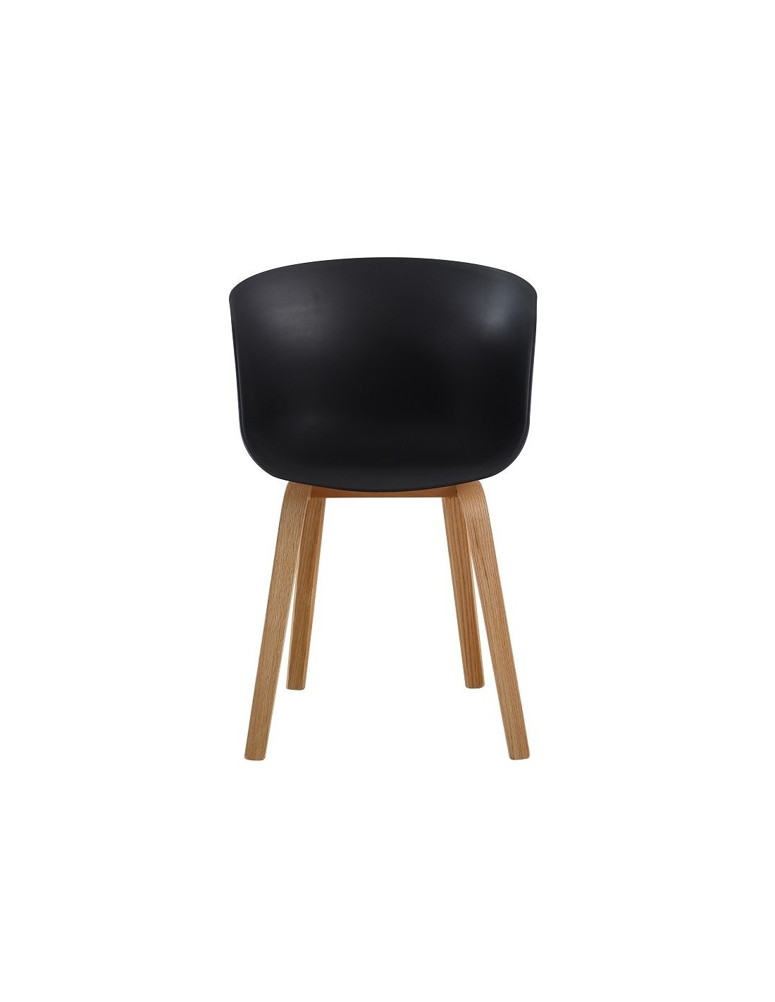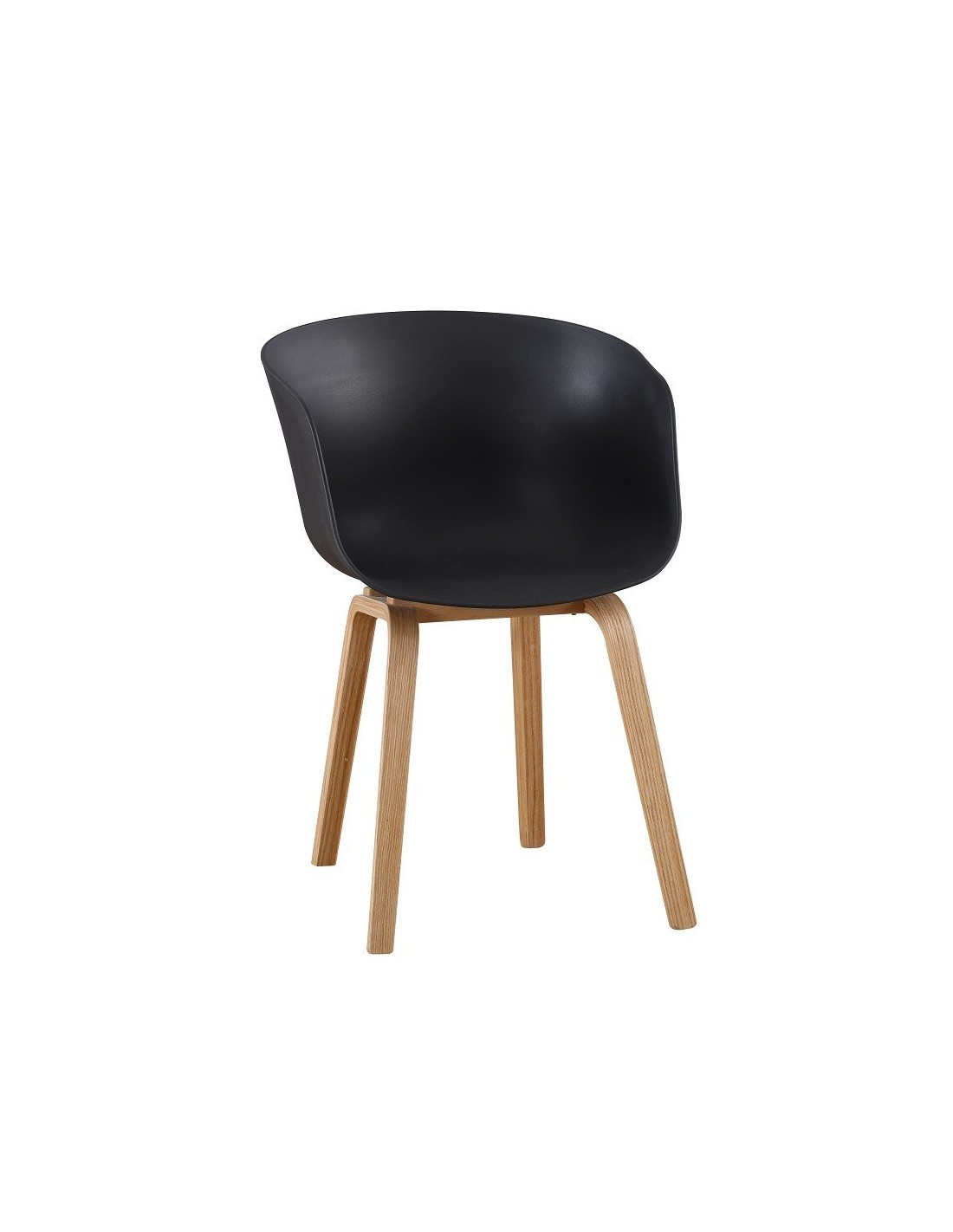 Sillón de diseño, armazón de madera curvada, carcasa de polipropileno negro. Taburete a juego