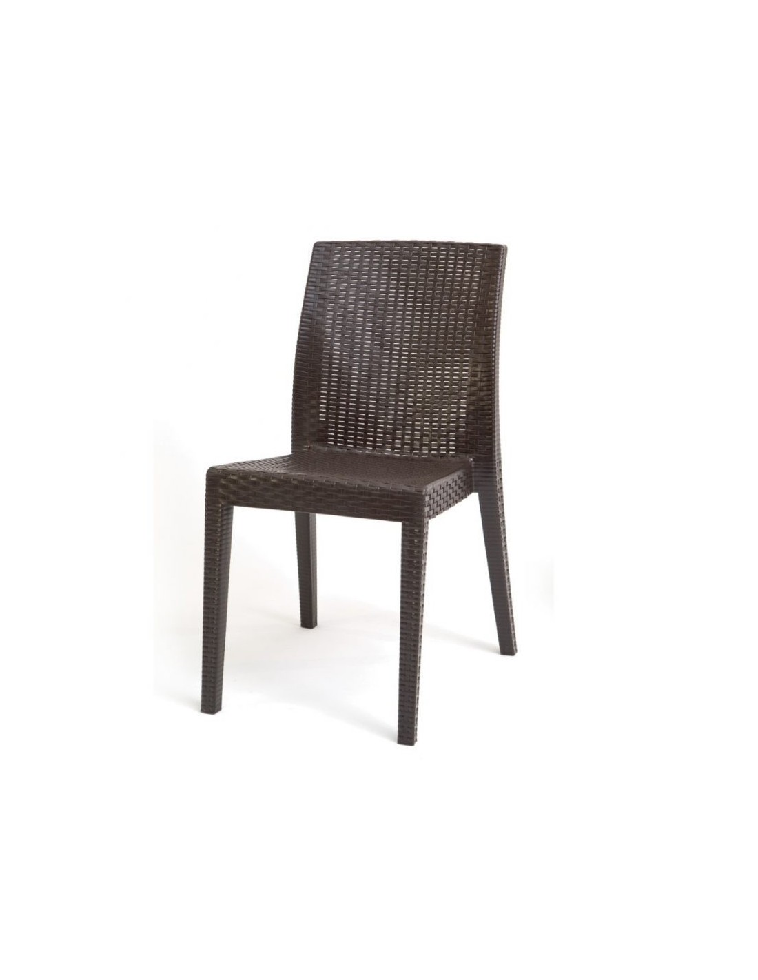 Silla apilable, imitación a rattán, polipropileno marrón chocolate. Uso en exterior e interior. Otros colores disponibles. Mesas y sillón a juego.
