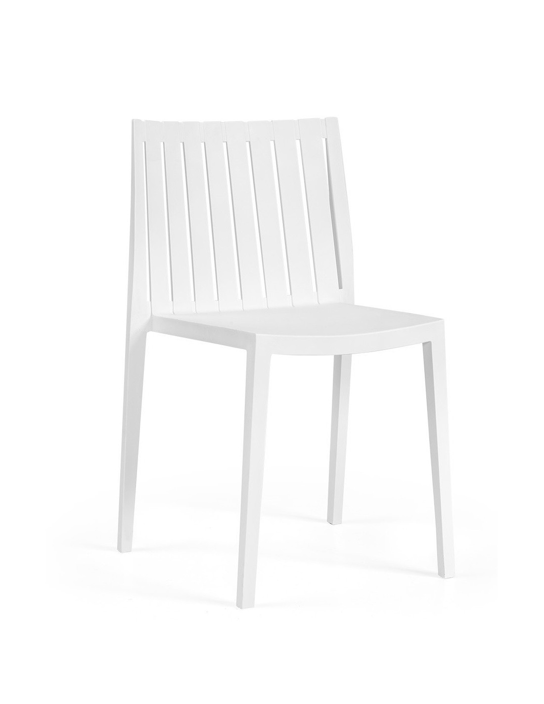 Silla de diseño, apilable, polipropileno reforzado con fibra de vidrio de color blanco. Tratamiento anti rayos UV. Uso en exterior e interior. Otros colores disponibles. Sillón, Taburete y mesa a juego