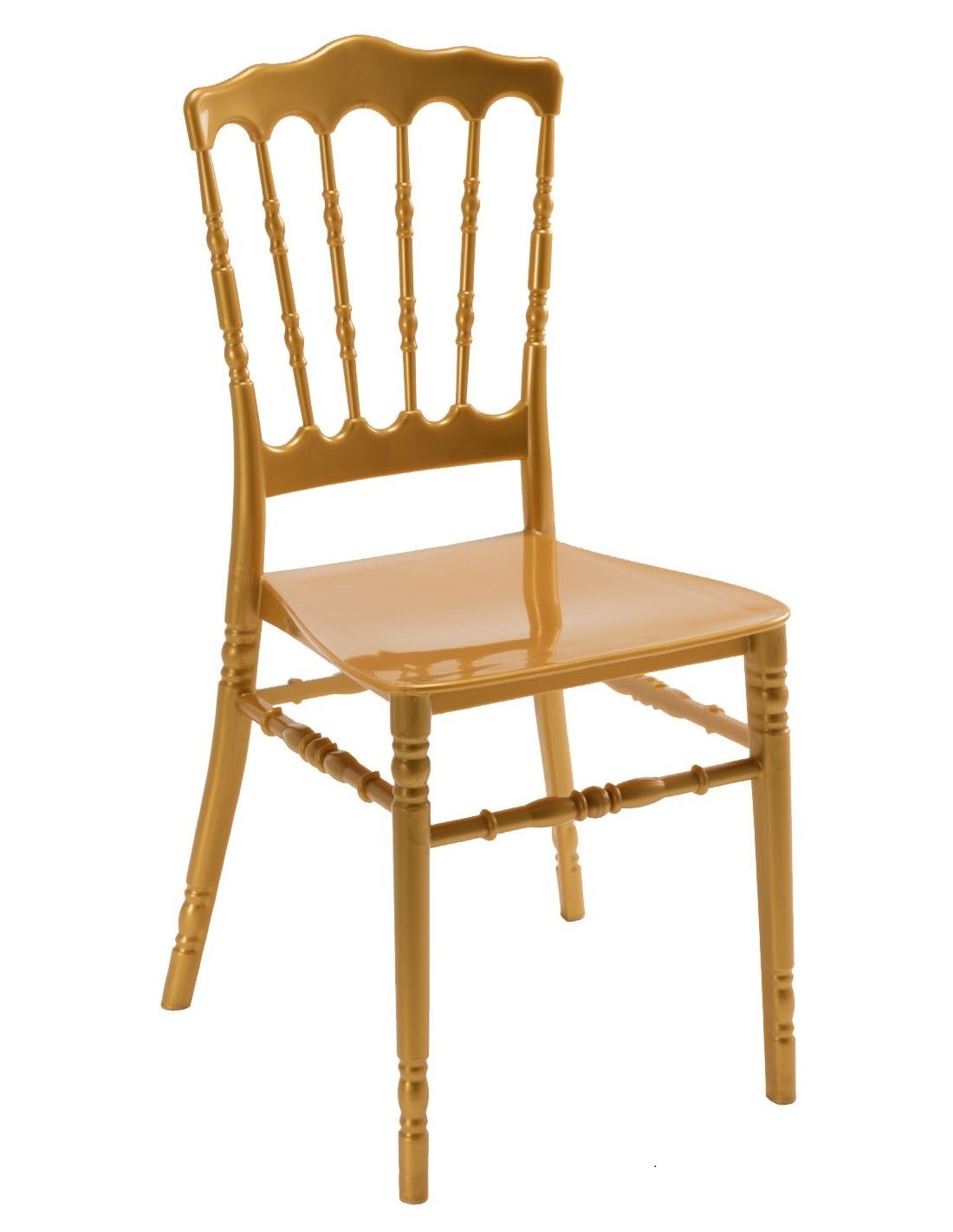 Silla de catering y eventos, apilable, polipropileno de color dorado. Uso en exterior e interior. Silla muy resistente para uso en hostelería y doméstico. Inyección asistida por gas. Otros colores diponibles.