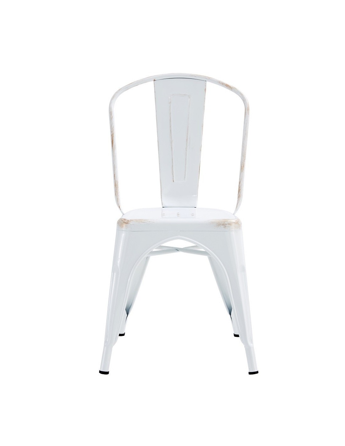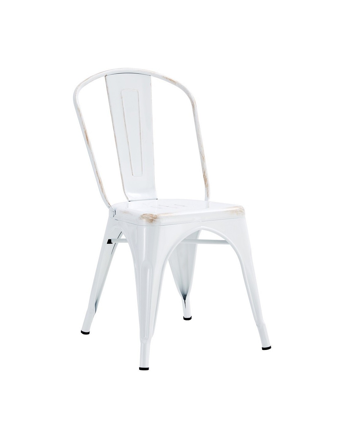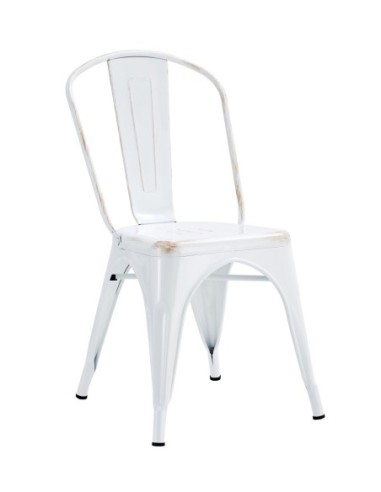 Silla de diseño, estructura de acero, pintada en blanco con acabado vintage. Uso en interiores o exteriores. Otros acabados y colores disponibles. Mesa, sillón y taburete a juego.