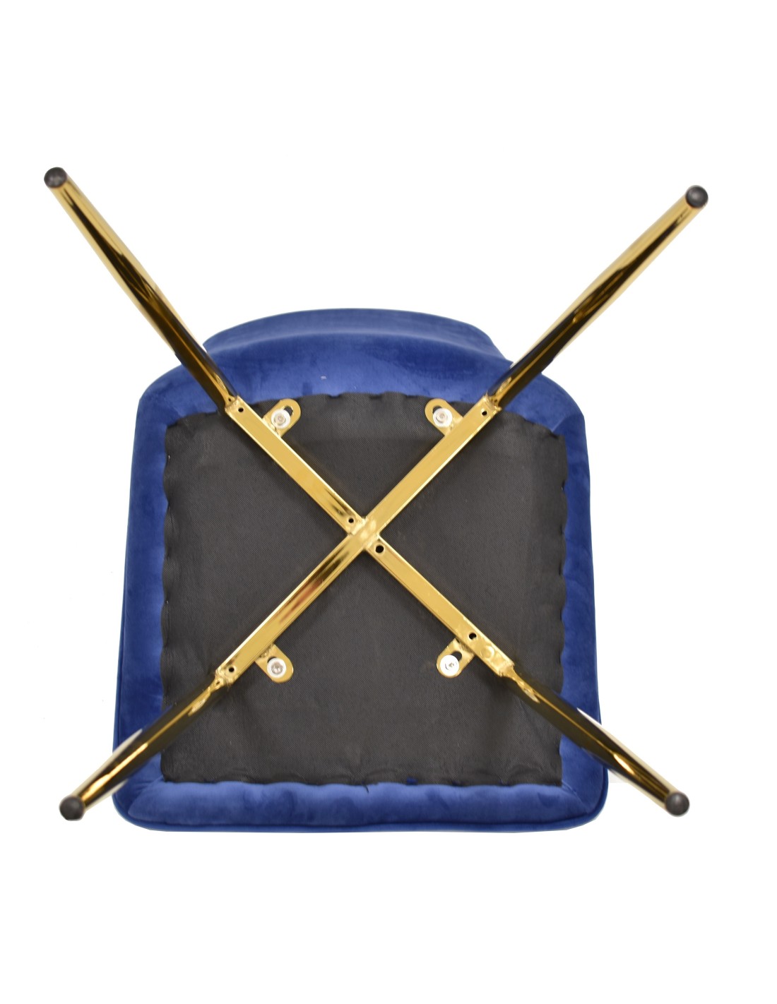 Silla de diseño, armazón metálico con acabado dorado, asiento y respaldo tapizados en tejido velvet de color azul. Otros colores disponibles.
