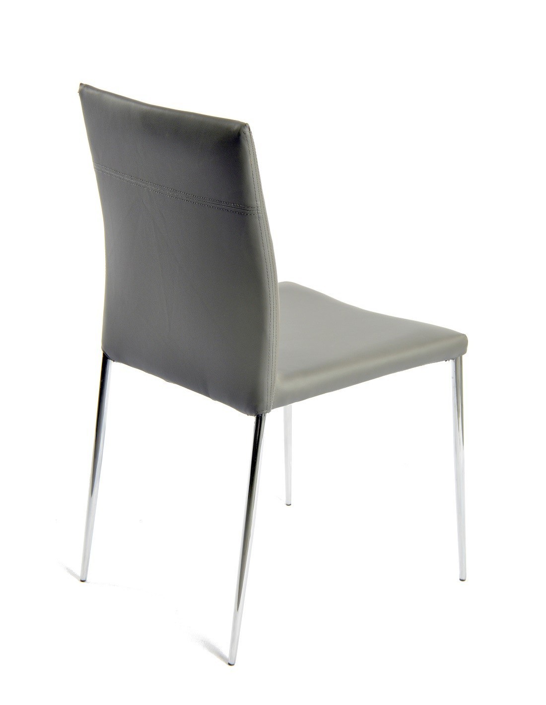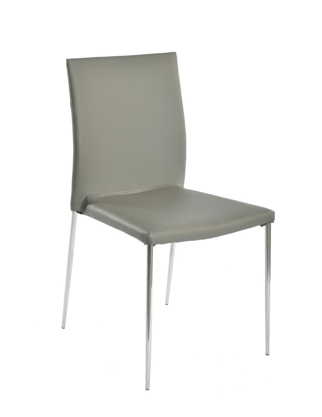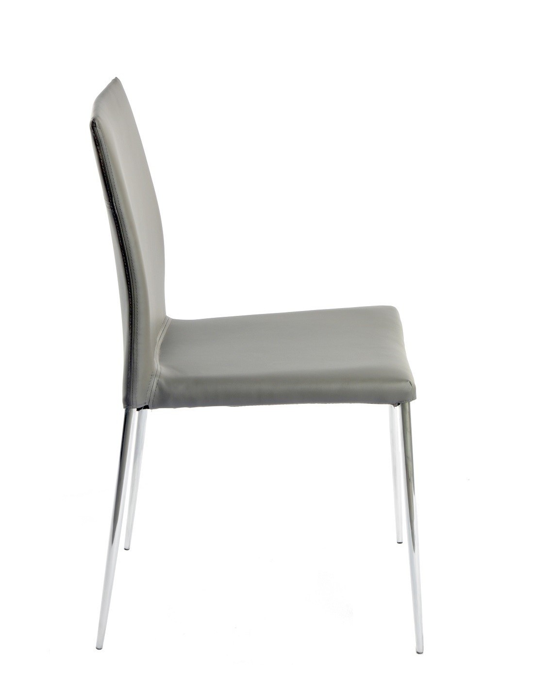 Silla de diseño, apilable, armazón metálico con acabado cromado, asiento y respaldo tapizados en similpiel de color gris oscuro. Otros colores disponibles.
