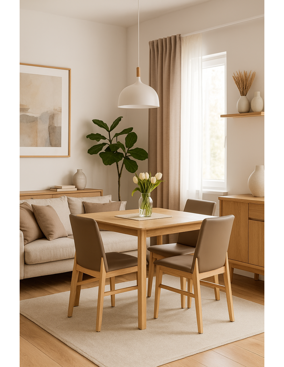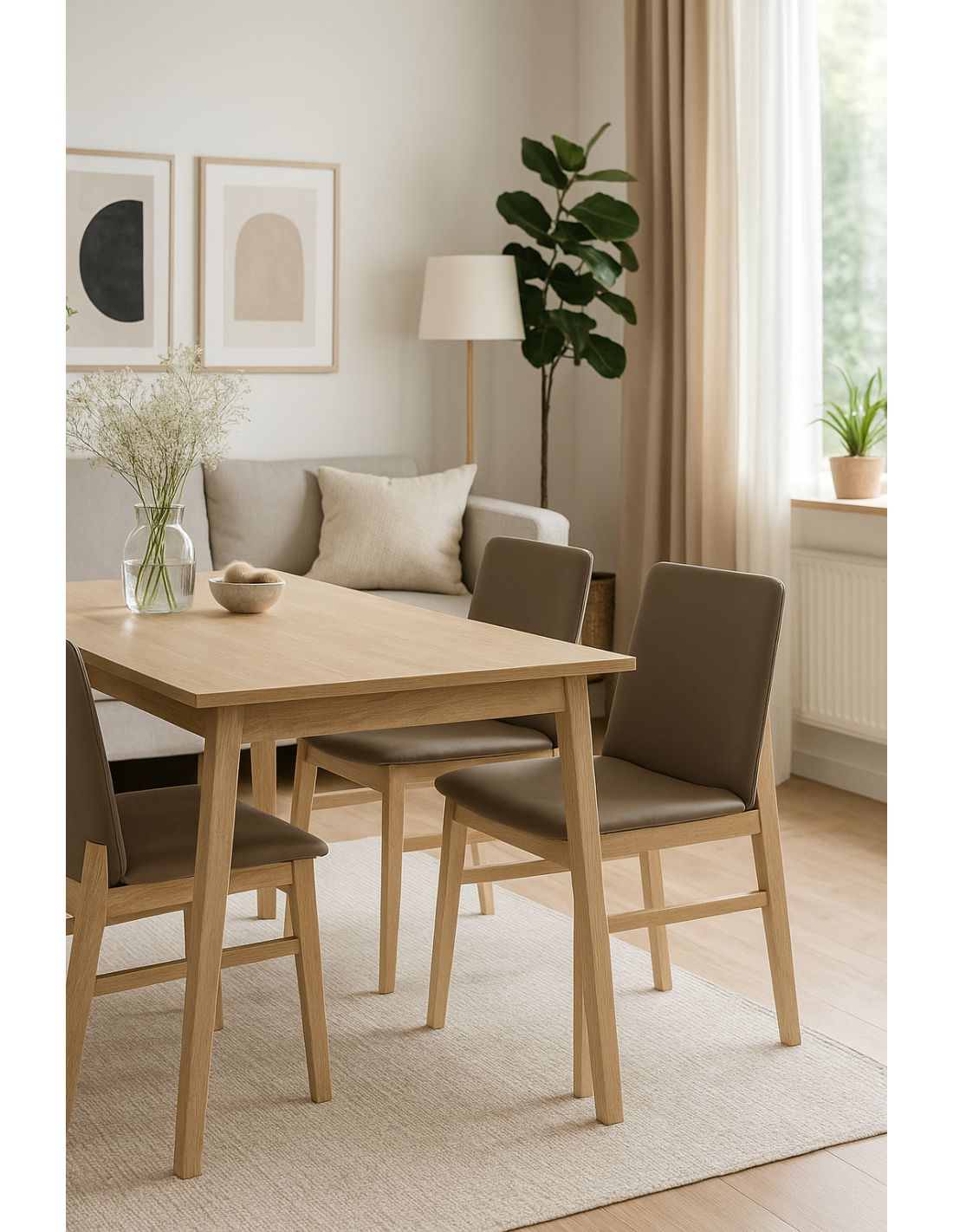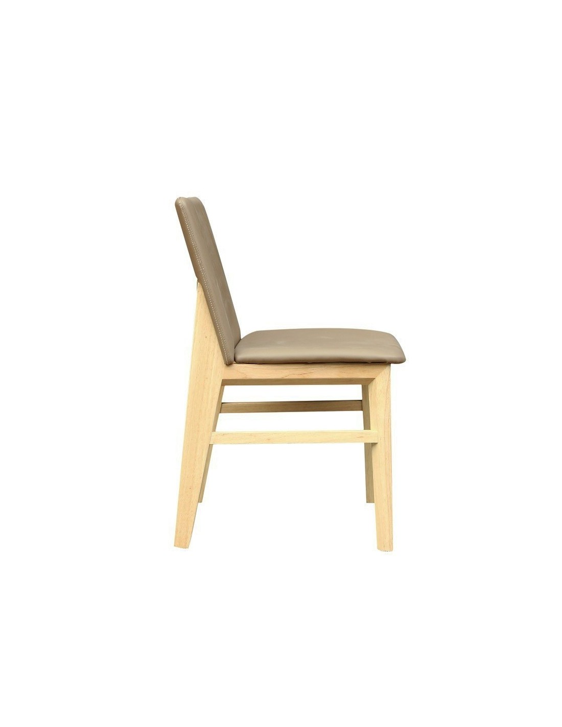 Silla de diseño, multiusos, madera de haya, barnizada natural, asiento y respaldo tapizado similpiel marrón