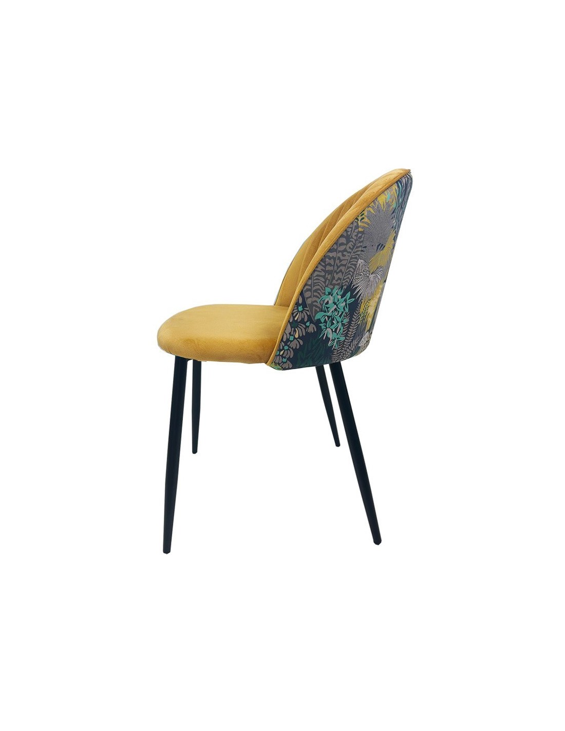 -Asiento y respaldo tapizados en terciopelo de color amarillo, trasera del respaldo en tejido decorado palm
