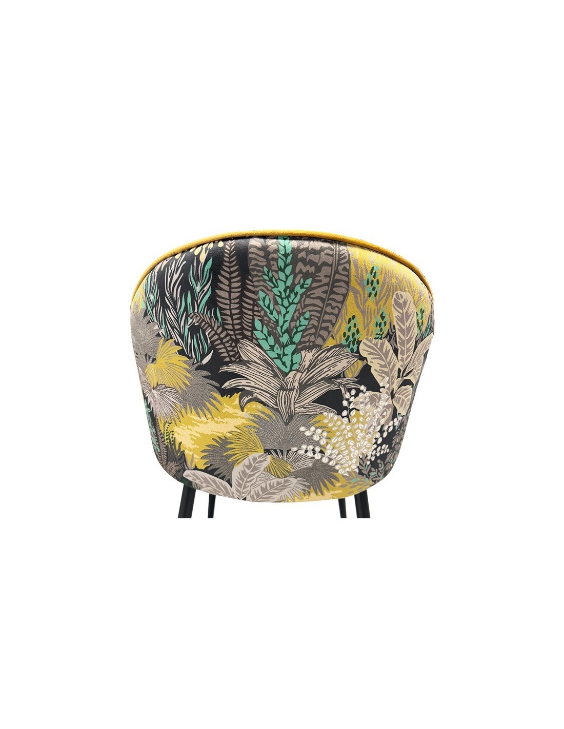Silla de diseño, armazón metálico con acabado epoxi negro, asiento y respaldo tapizados en terciopelo amarillo, trasera en tejido decorado palm. Otros colores disponibles. Taburete a juego