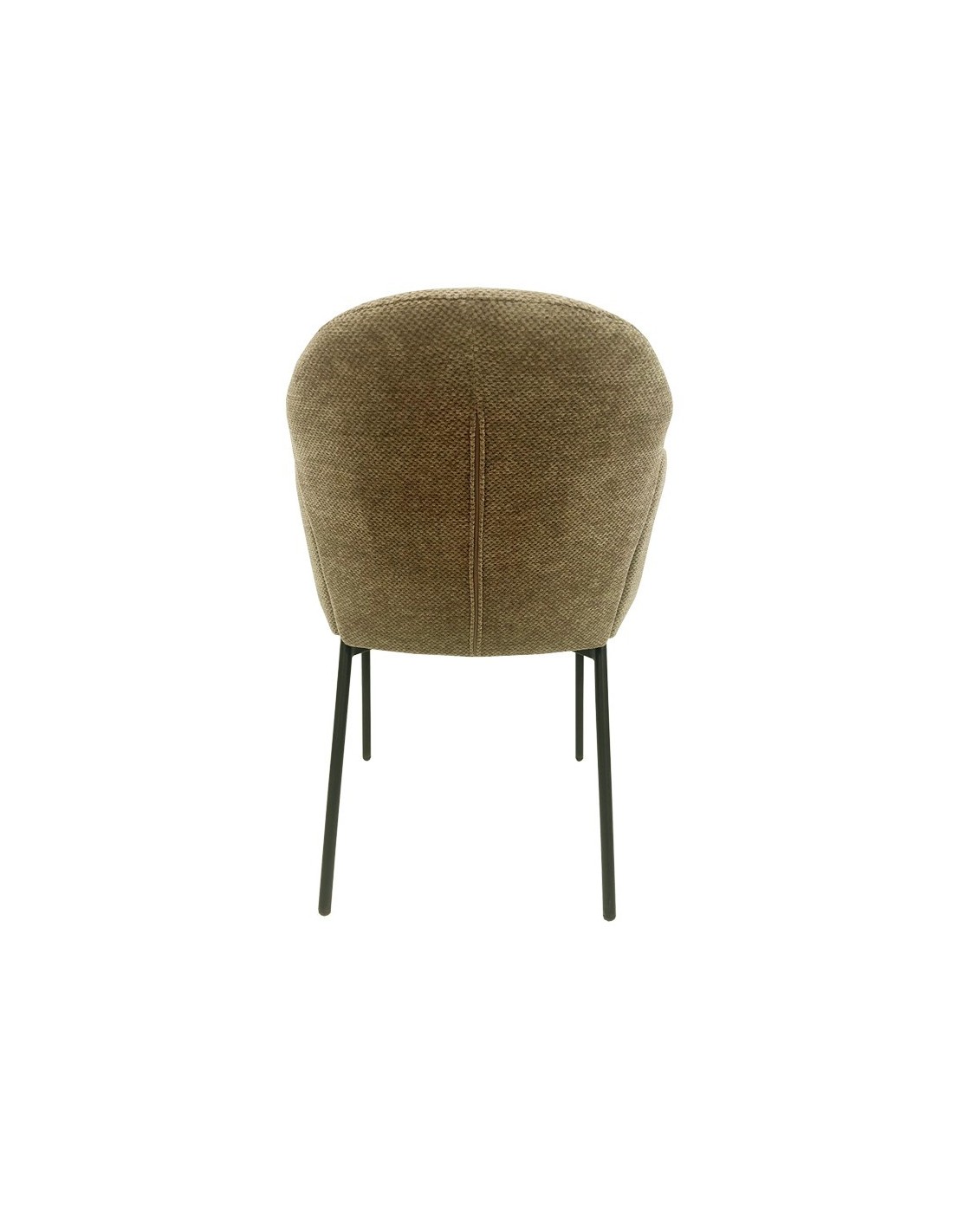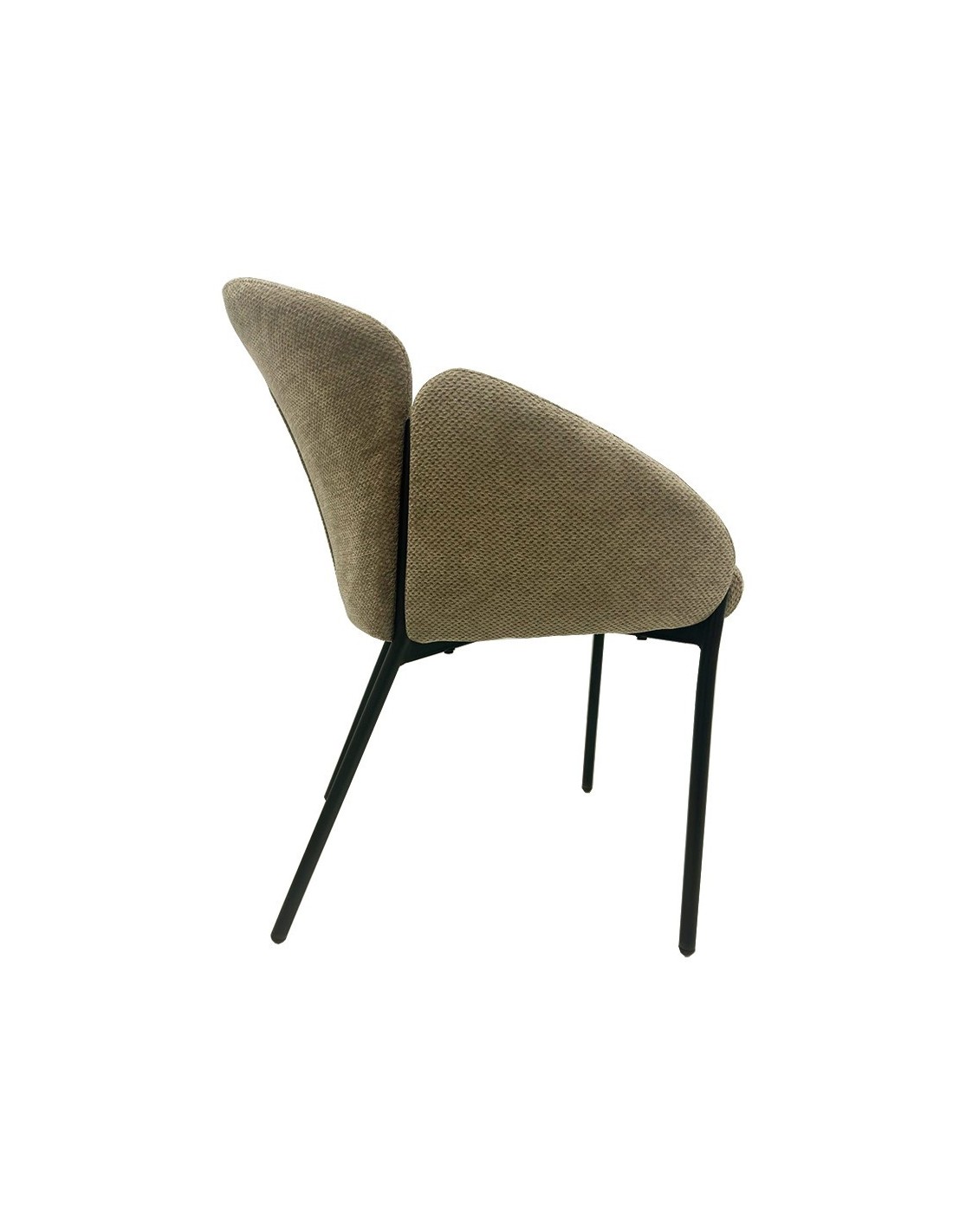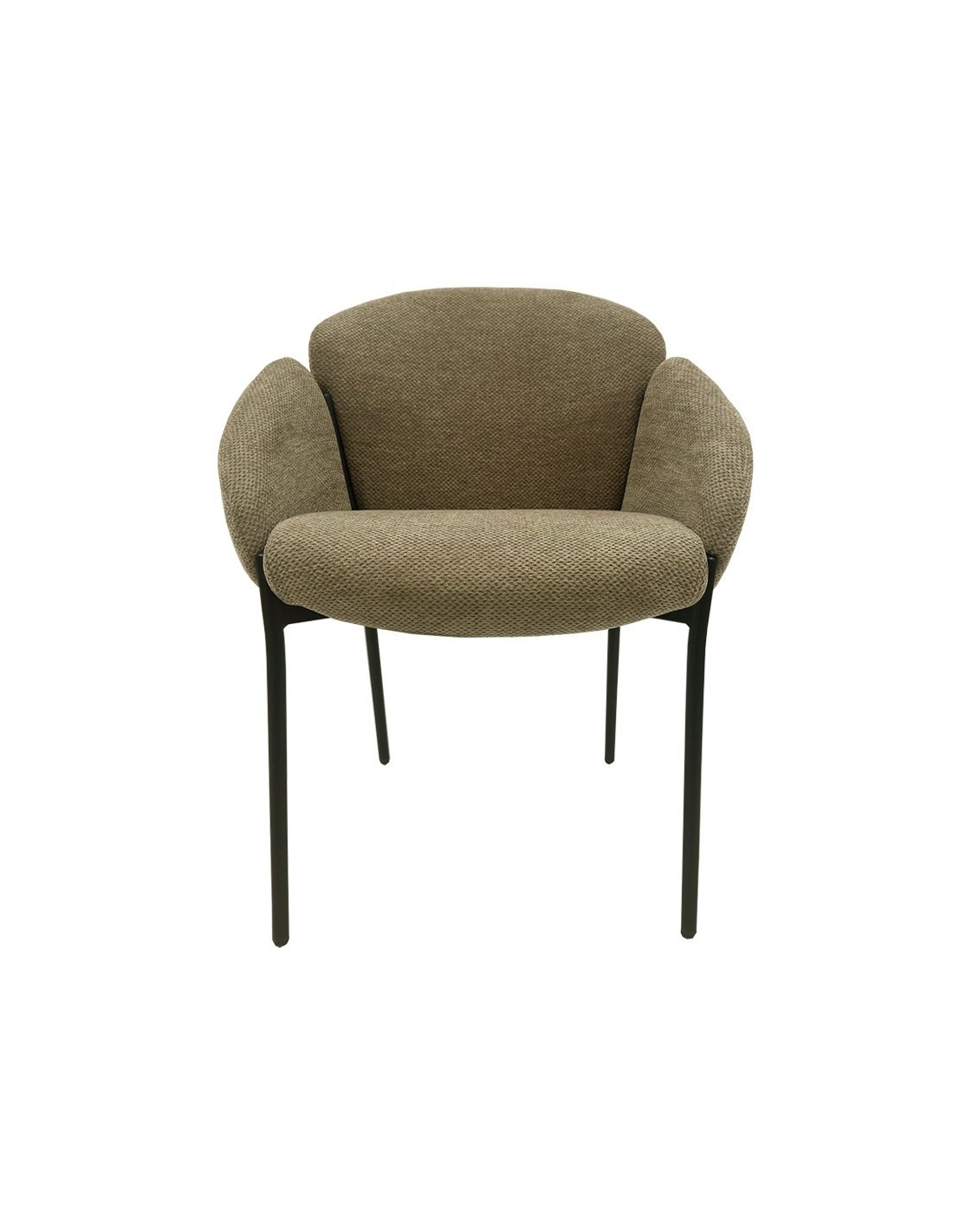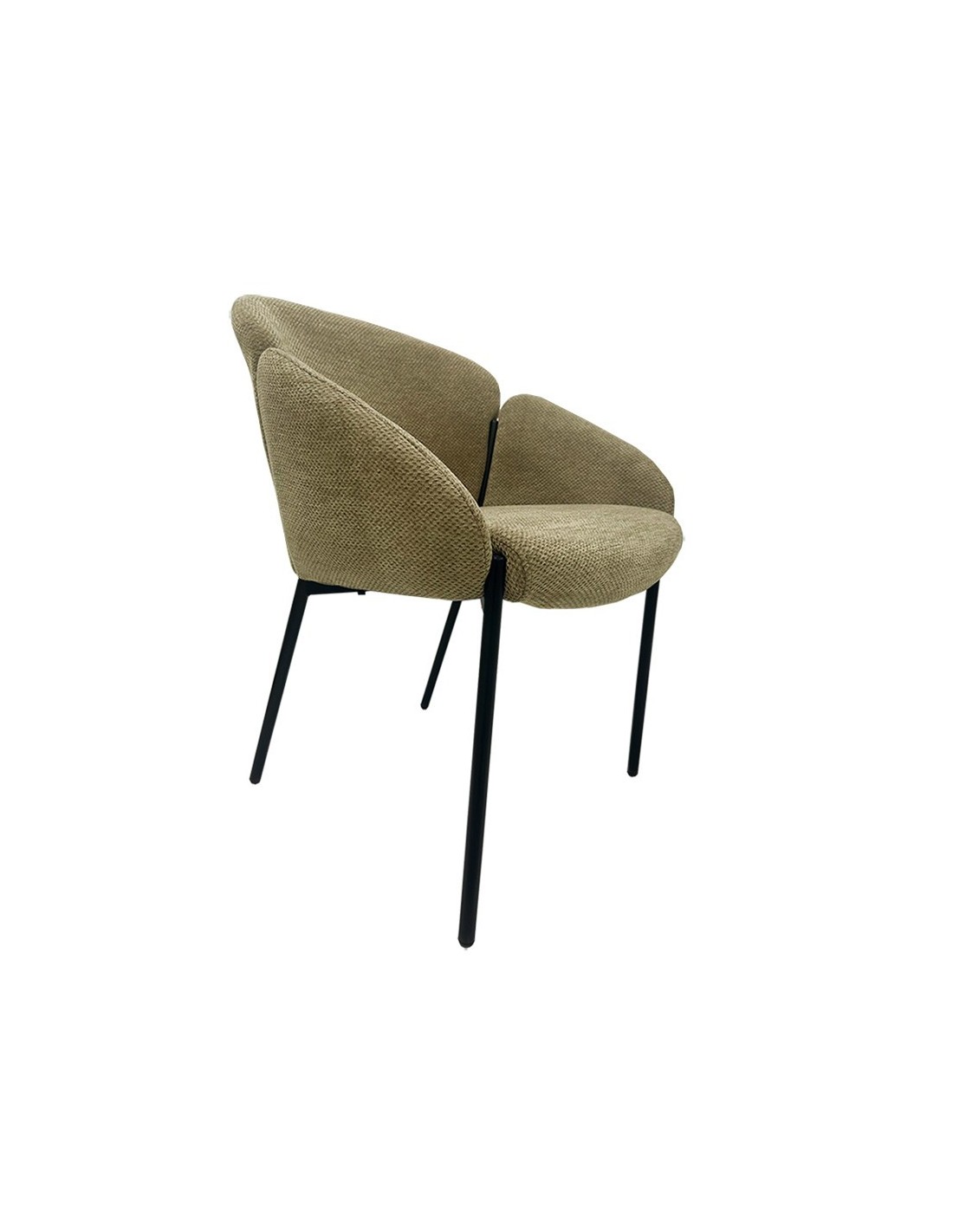 Sillón de diseño, patas metálicas con acabado imitación madera, asiento y respaldo tapizados en tejido linen gris oscuro. Otros colores disponibles.