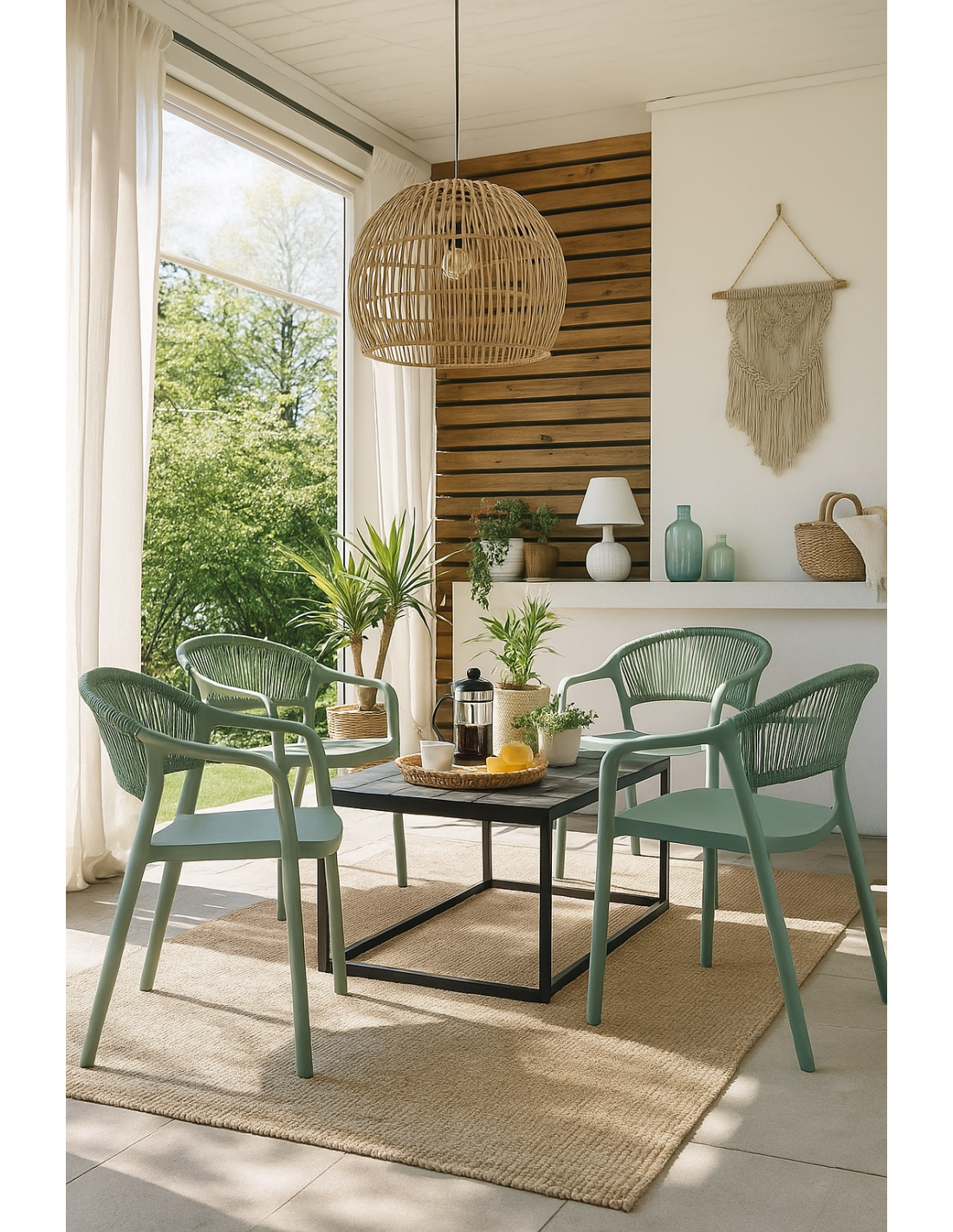Sillón IBIZA, apilable, tratamiento anti UV, polipropileno y cuerda verde claro