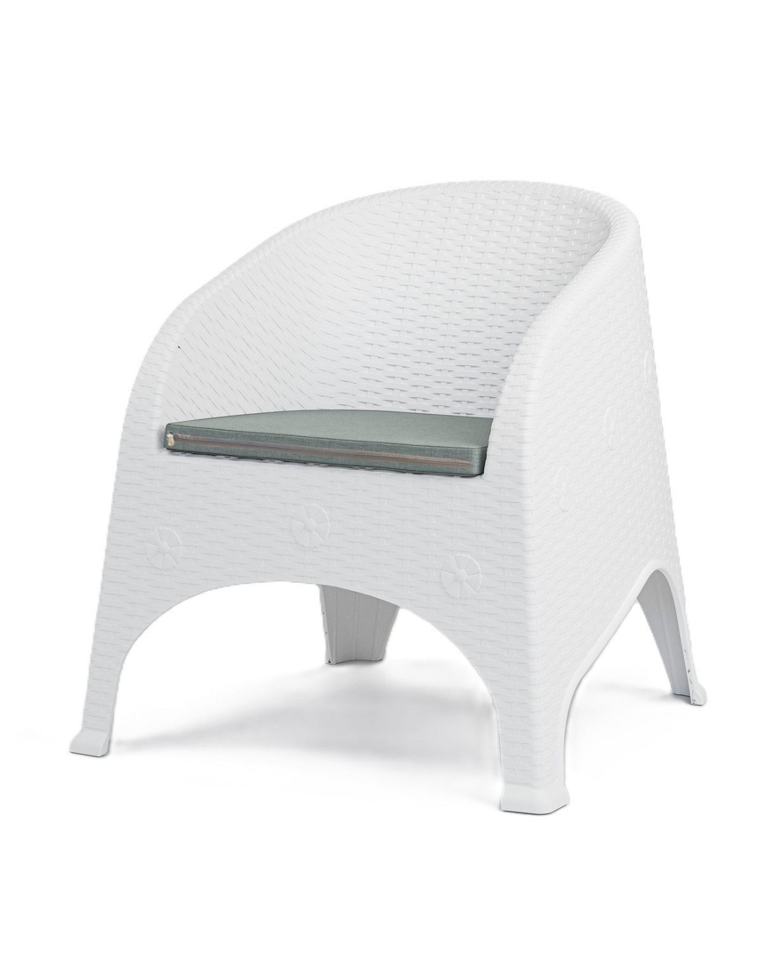 Sillón apilable, imitación a rattán, polipropileno blanco, cojín gris. Uso en exterior e interior. Otros colores disponibles.