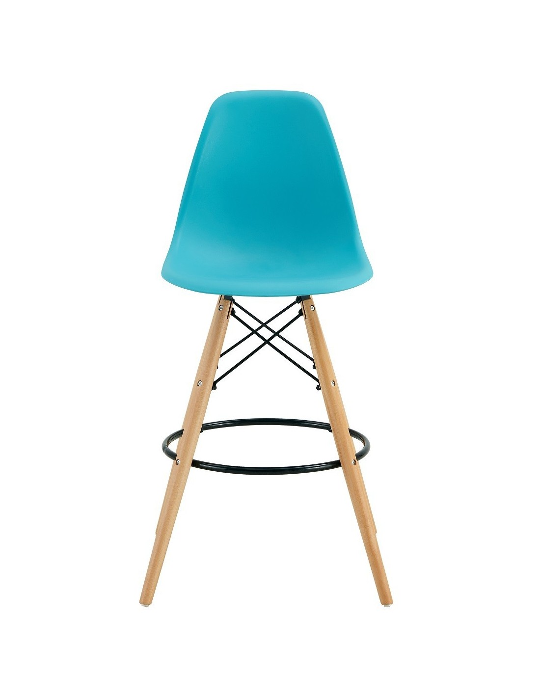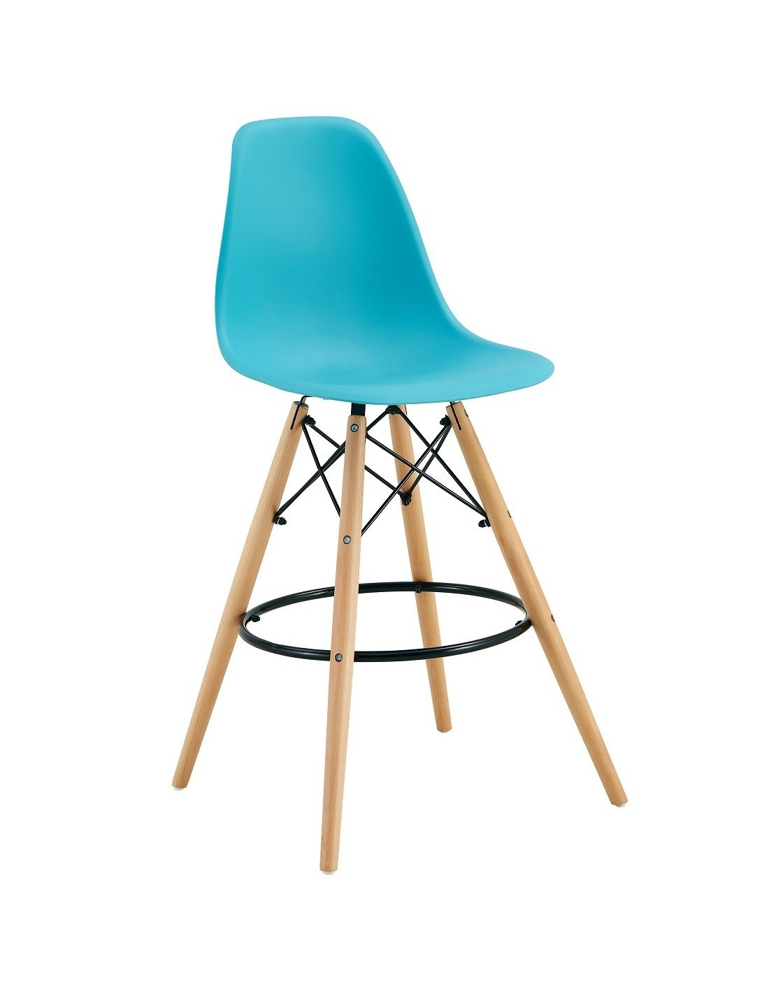 Taburete de diseño, madera, carcasa de polipropileno de color turquesa. Sillas y sillones a juego.