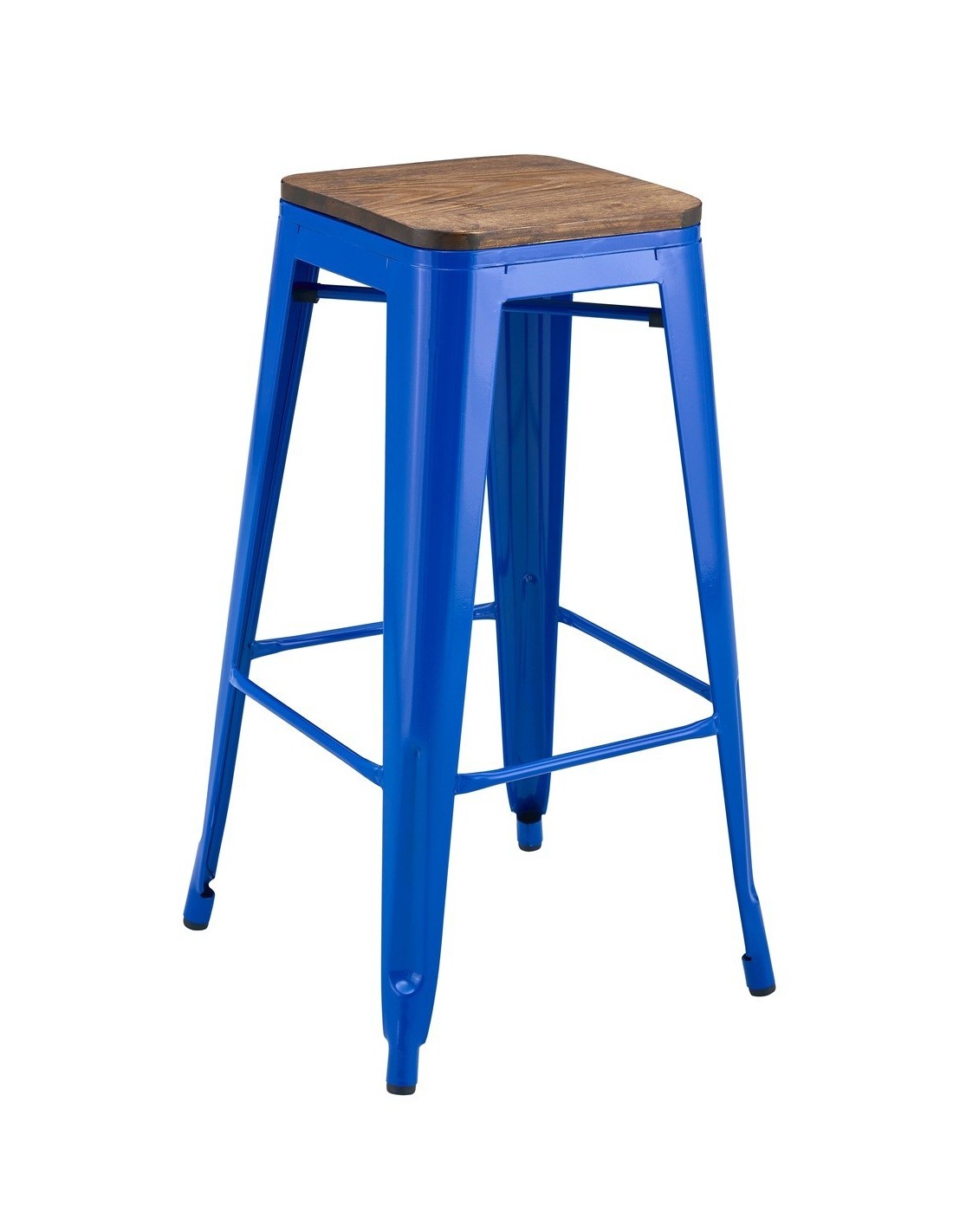 Taburete de diseño, estructura de acero, pintado en azul con asiento de madera. Uso en interiores o exteriores. Otros colores disponibles. Mesa, silla y sillón a juego