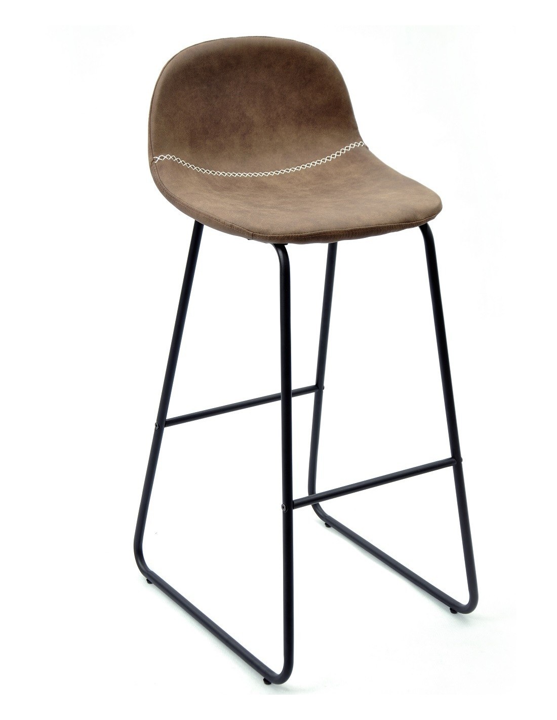 Taburete de diseño, armazón metálico pintado en negro, asiento tapizado en similpiel vintage marrón oscuro. Uso en interiores.