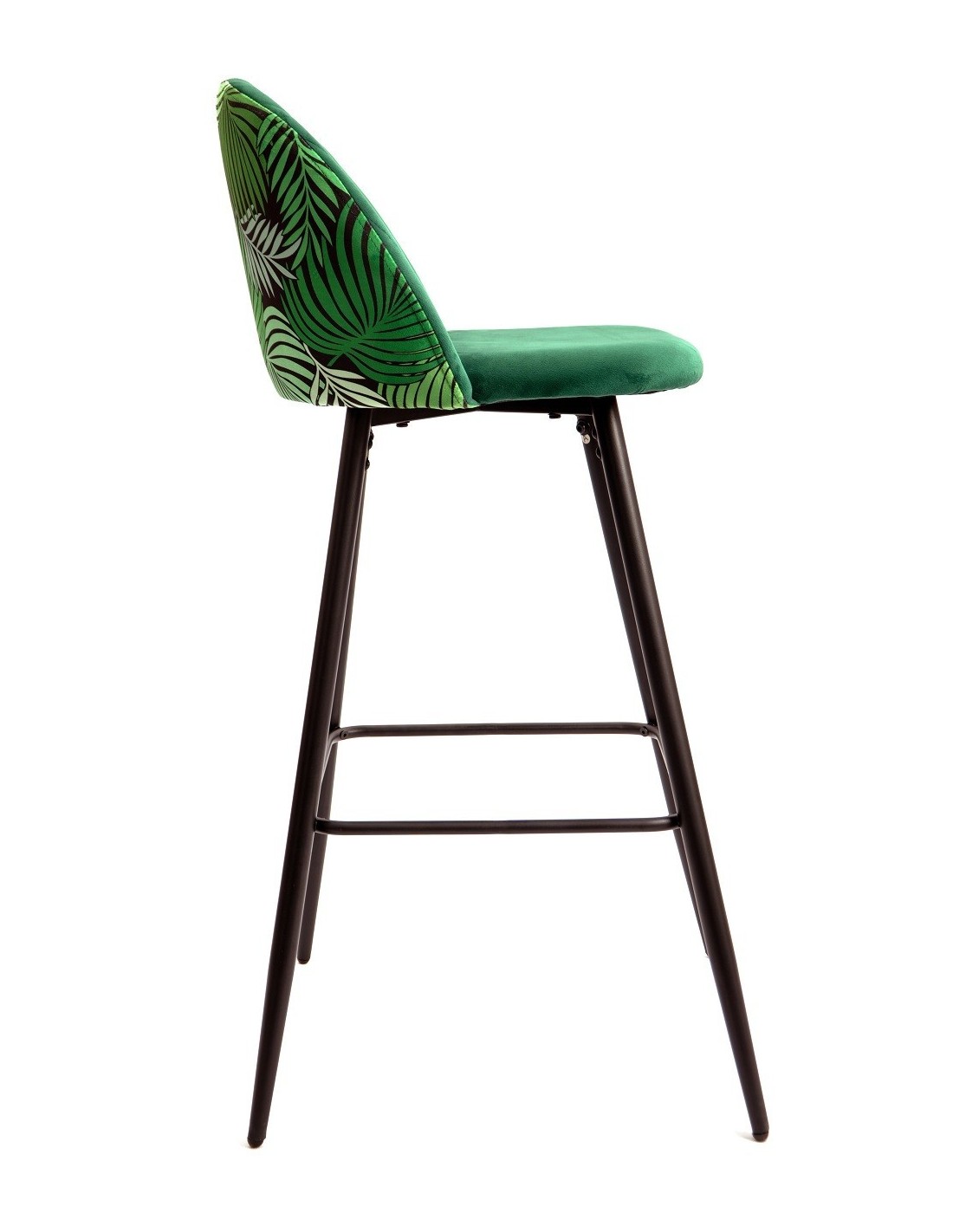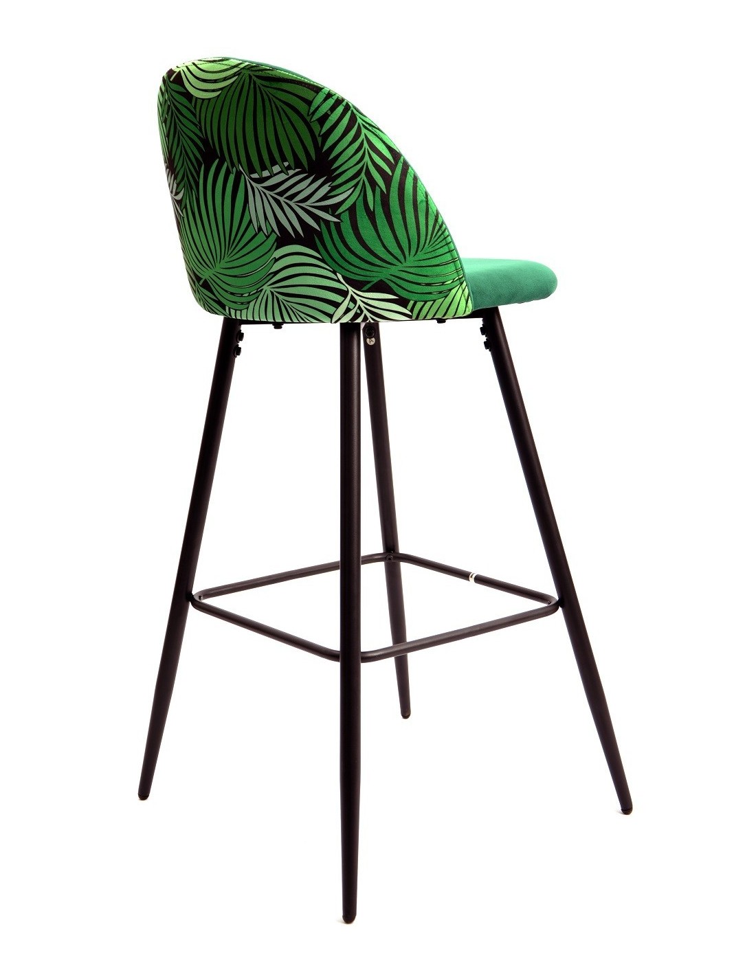 Taburete de diseño, armazón metálico con acabado epoxi negro, asiento y respaldo tapizados en terciopelo verde, trasera en tejido decorado floral a juego. Otros colores disponibles. Silla a juego