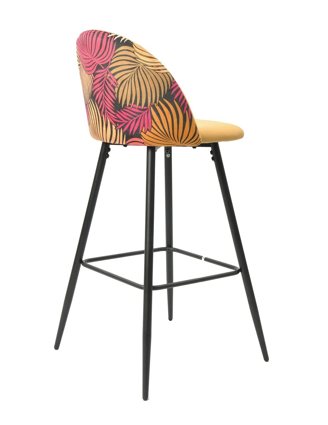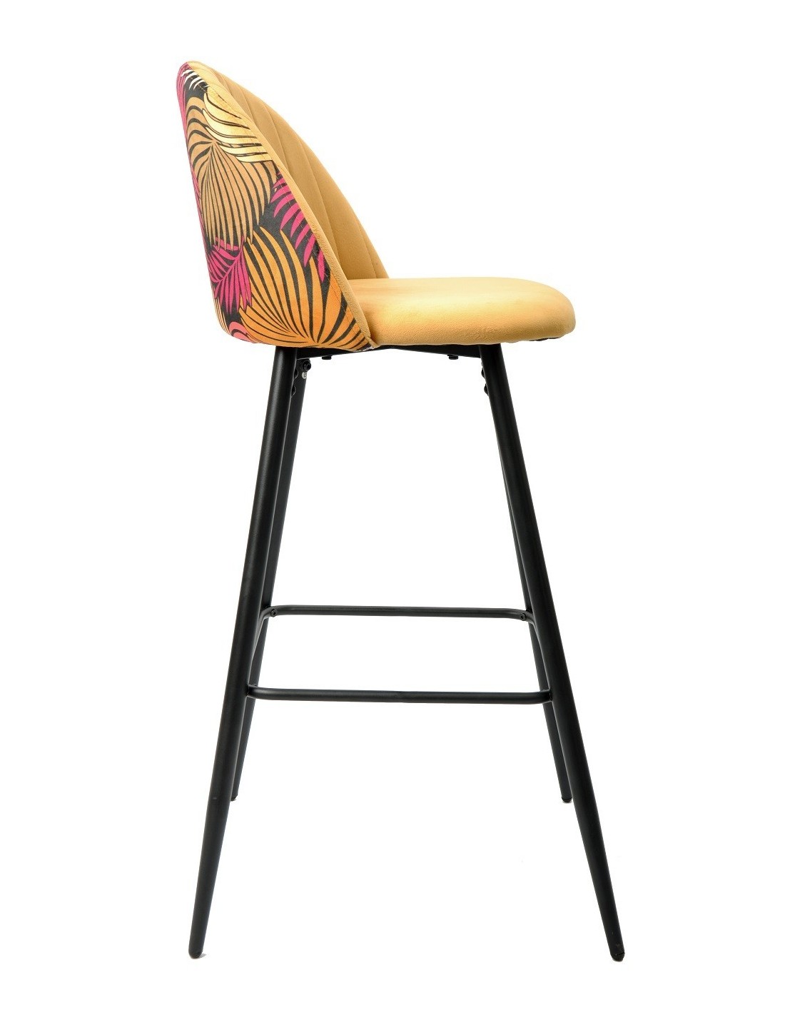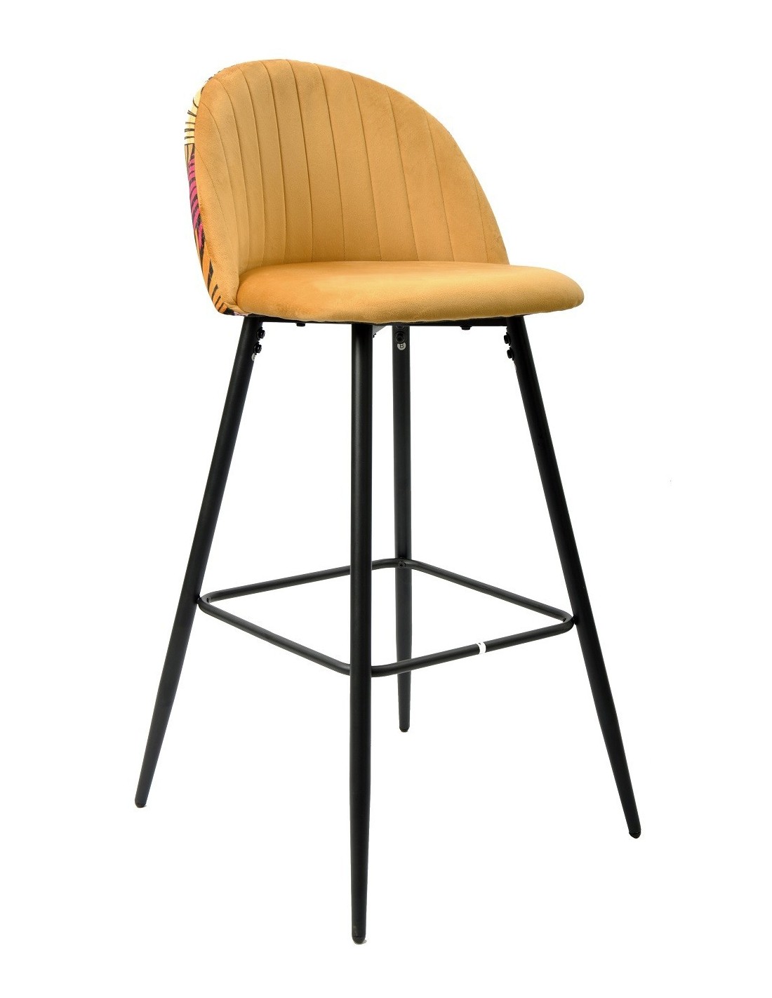 Taburete de diseño, armazón metálico con acabado epoxi negro, asiento y respaldo tapizados en terciopelo amarillol, trasera en tejido decorado floral a juego. Otros colores disponibles. Silla a juego