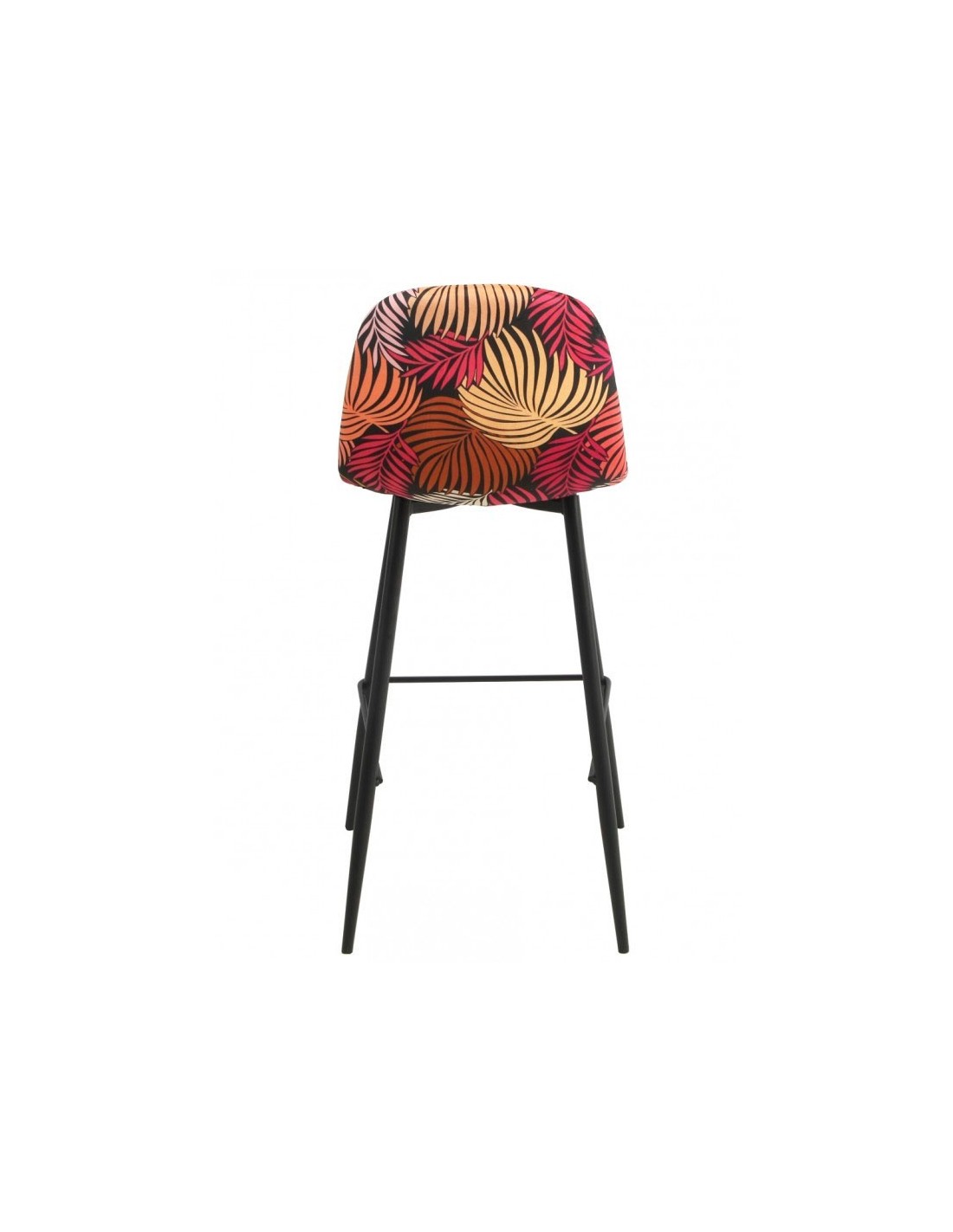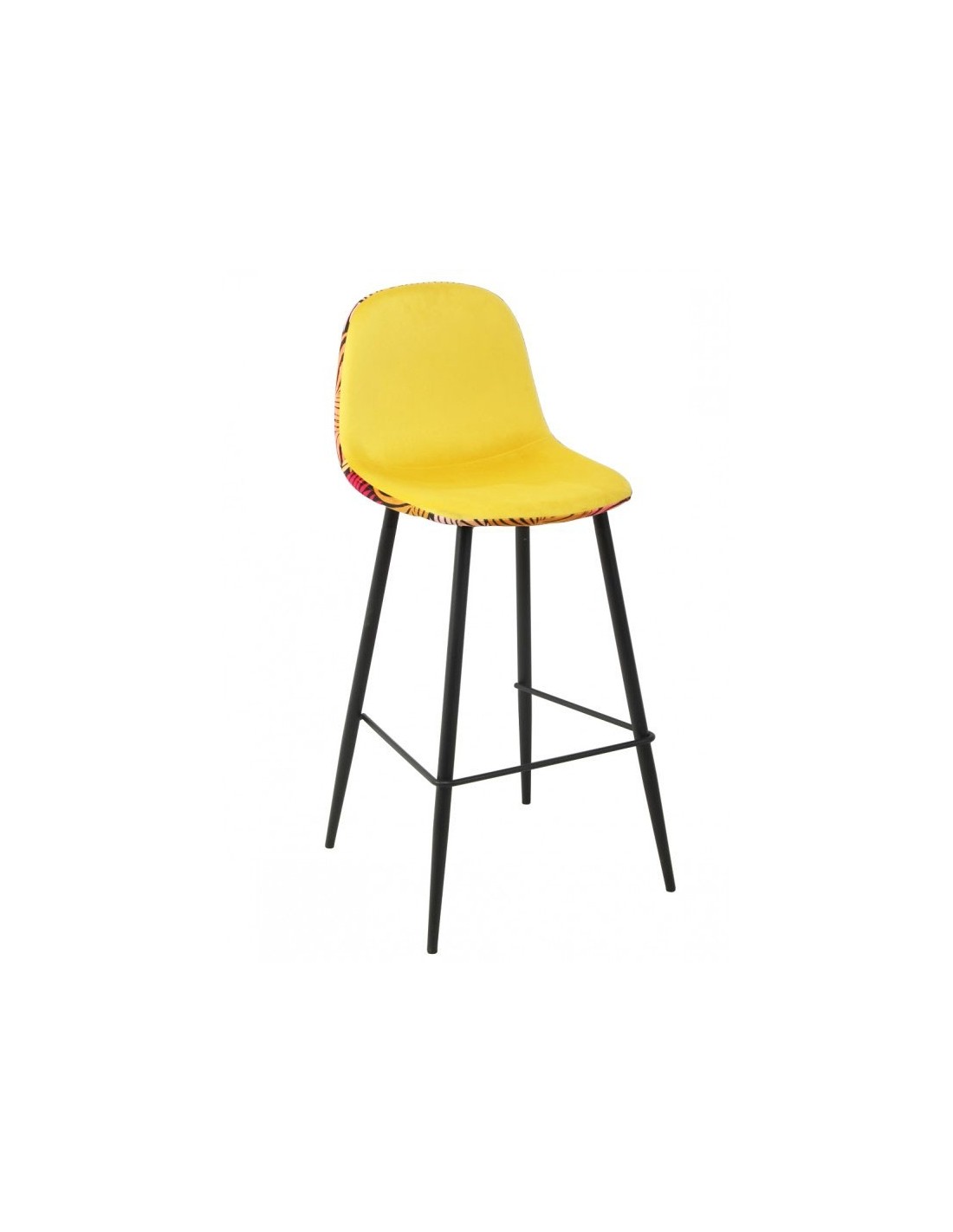 Taburete de diseño, armazón metálico con acabado epoxi negro, asiento y respaldo tapizados en terciopelo amarillo, trasera en tejido decorado floral a juego. Otros colores disponibles. Silla a juego